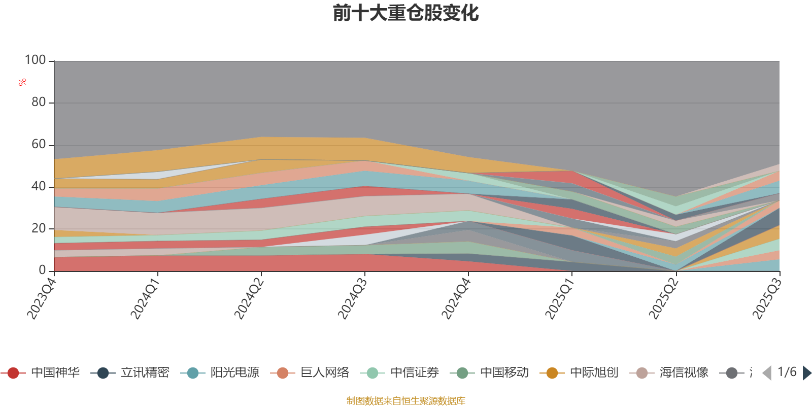 截至2025年三季度末,基金十大重仓股分别是宁德时代、中际旭创、工业富联、阳光电源、中信证券、新易盛、巨人网络、东方财富、亿纬锂能、兆易创新。