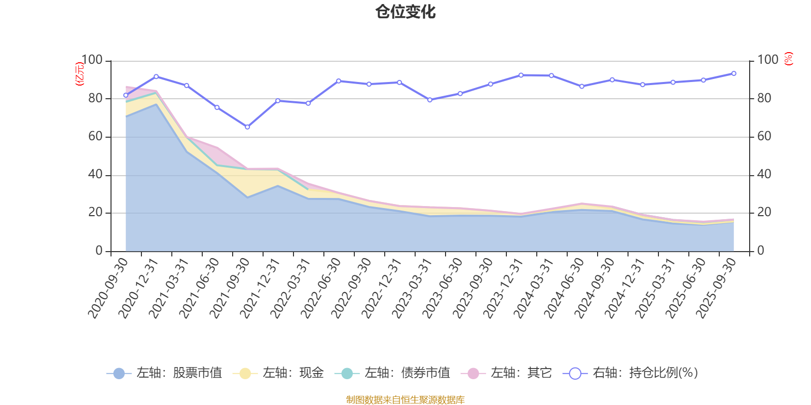 据定期报告数据统计,近三年平均股票仓位为88.27%,同类平均为72.35%。2025年三季度末基金达到93.35%的最高仓位,2021年三季度末最低,为65.26%。