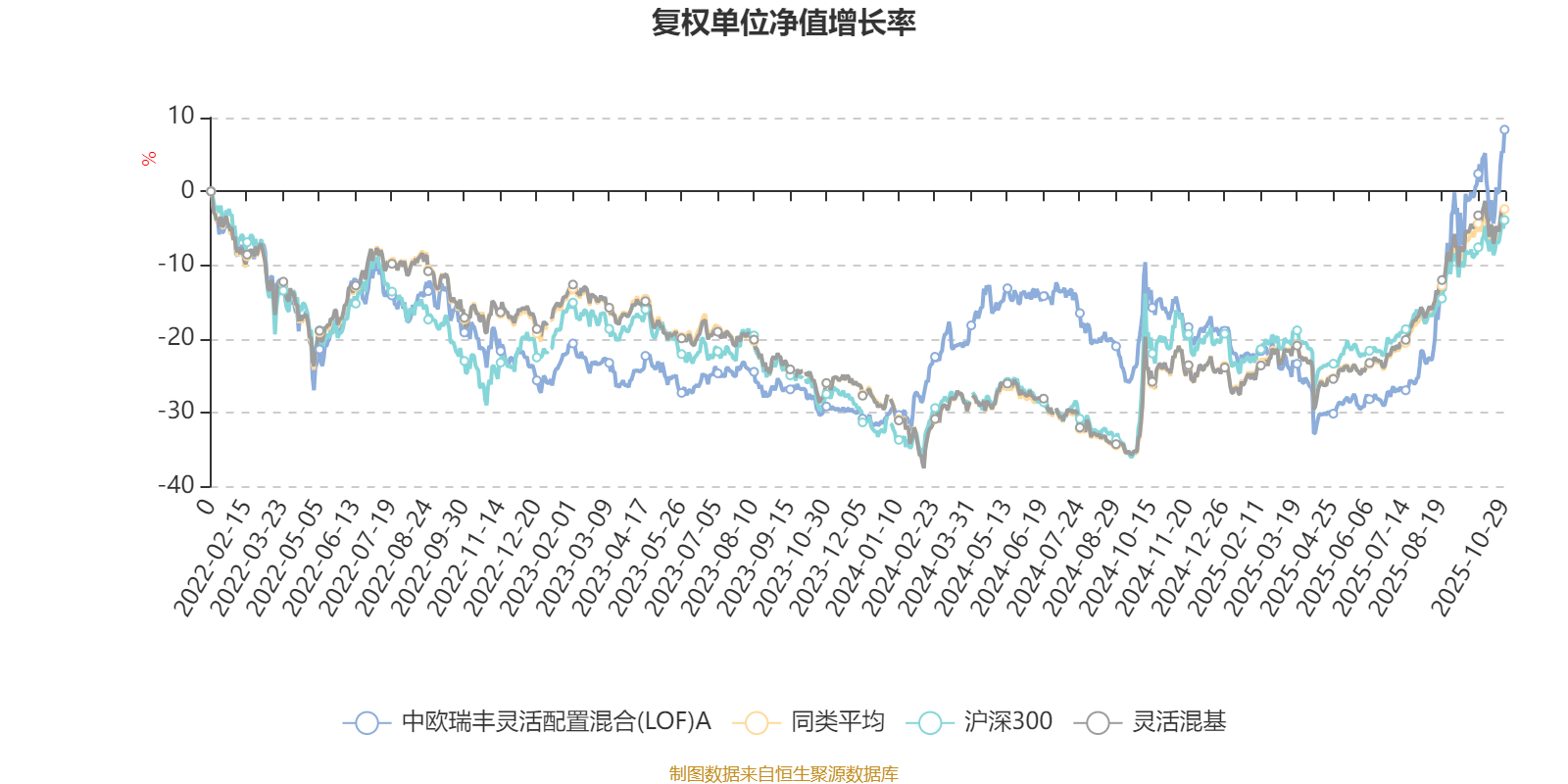 截至10月29日,中欧瑞丰灵活配置混合(LOF)A近三个月复权单位净值增长率为38.35%,位于同类可比基金95/1287;近半年复权单位净值增长率为53.75%,位于同类可比基金151/1287;近一年复权单位净值增长率为29.51%,位于同类可比基金504/1287;近三年复权单位净值增长率为39.74%,位于同类可比基金265/1286。