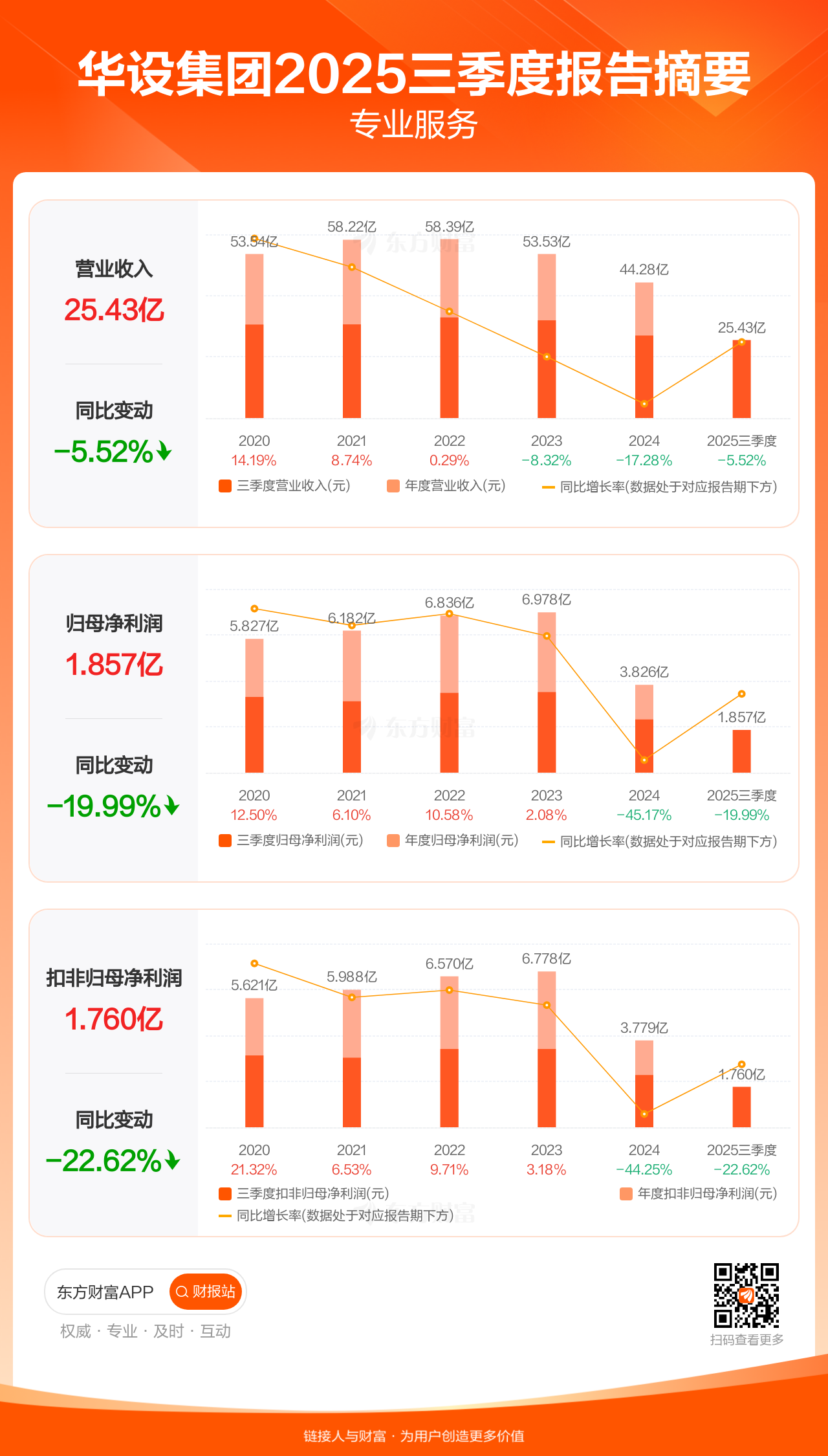 华设集团10月31日发布2025年三季报显示,公司前三季实现营业收入25.43亿元,同比下滑5.52%;归母净利润1.86亿元,同比下滑19.99%;扣非归母净利润1.76亿元,同比下滑22.62%。