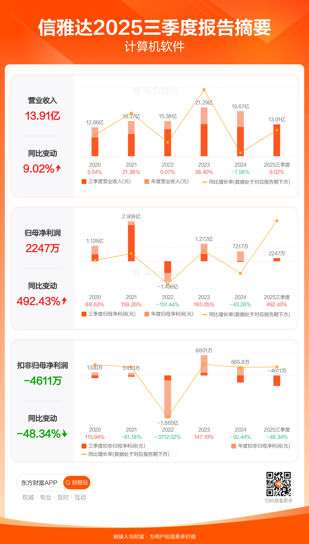 信雅达10月31日发布2025年三季报显示,公司前三季实现营业收入13.91亿元,同比增长9.02%;归母净利润2247.49万元,同比增长492.43%;扣非归母净利润-4611.04万元。