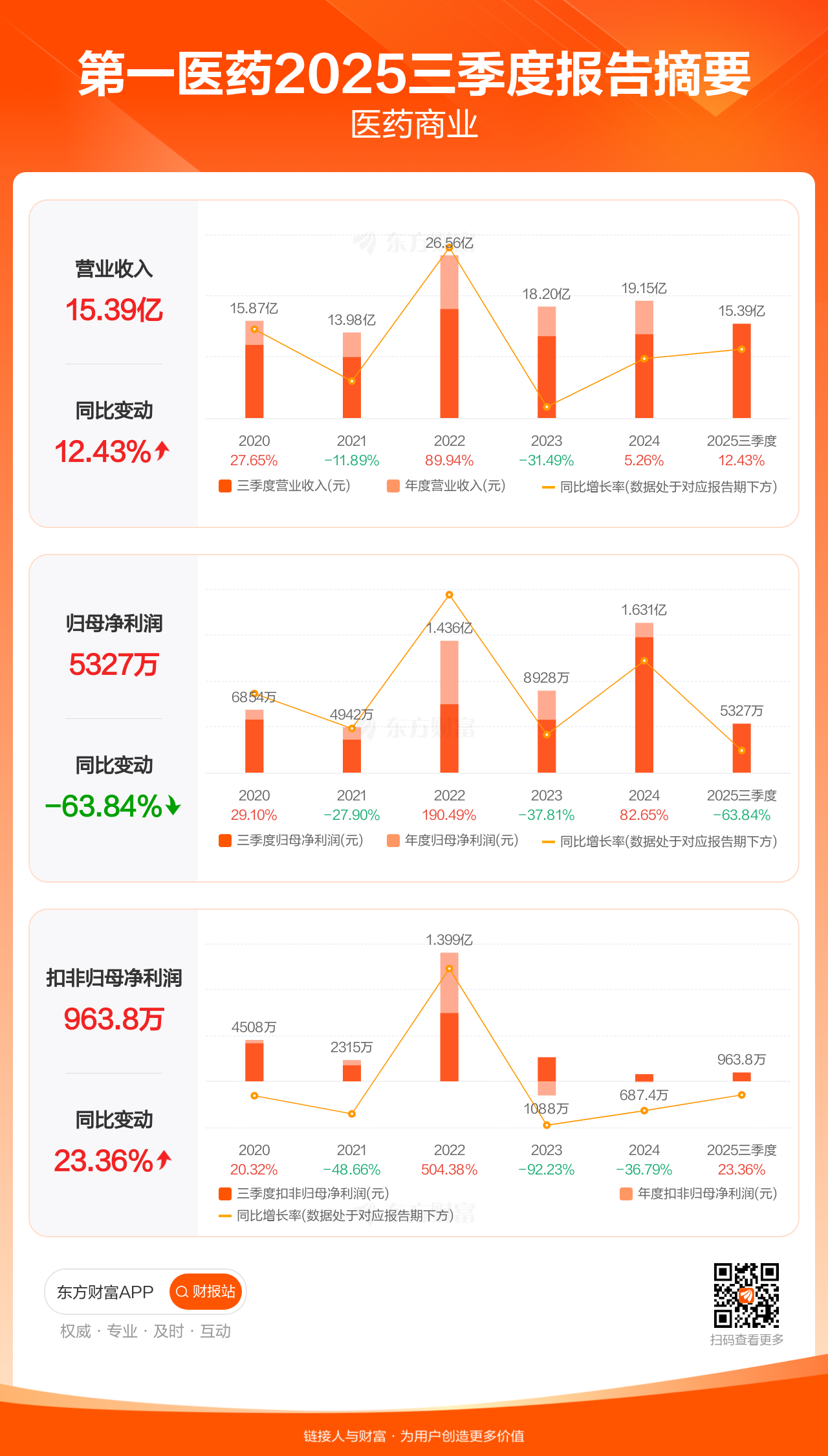 第一医药10月31日发布2025年三季报显示,公司前三季实现营业收入15.39亿元,同比增长12.43%;归母净利润5326.99万元,同比下滑63.84%;扣非归母净利润963.85万元,同比增长23.36%。