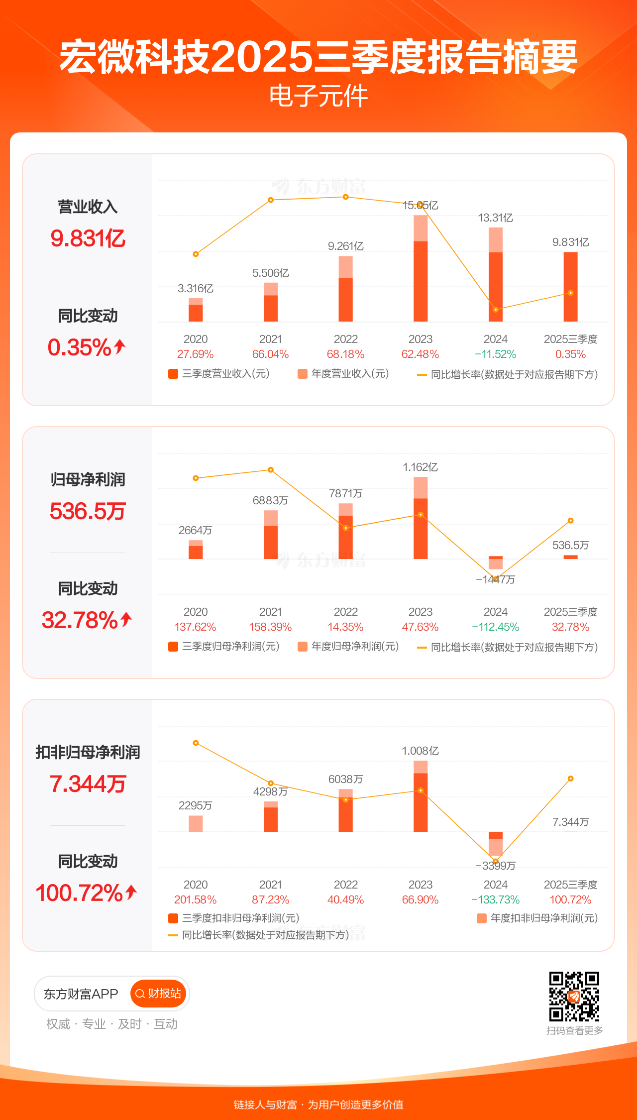 宏微科技10月31日发布2025年三季报显示,公司前三季实现营业收入9.83亿元,同比增长0.35%;归母净利润536.55万元,同比增长32.78%;扣非归母净利润7.34万元,同比增长100.72%。
