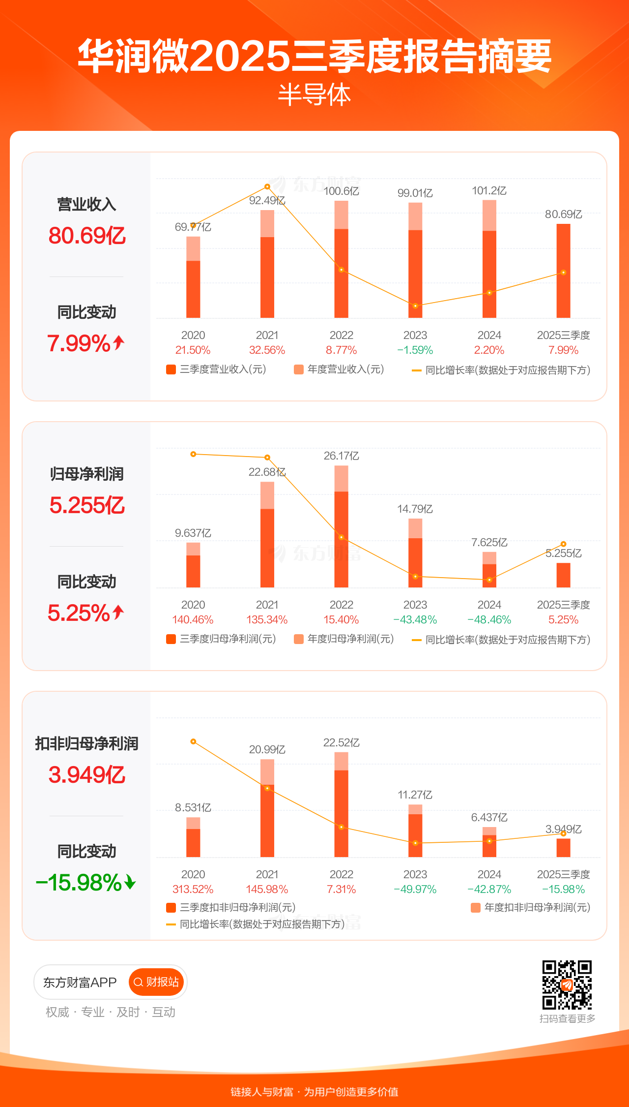 华润微10月31日发布2025年三季报显示,公司前三季实现营业收入80.69亿元,同比增长7.99%;归母净利润5.26亿元,同比增长5.25%;扣非归母净利润3.95亿元,同比下滑15.98%。