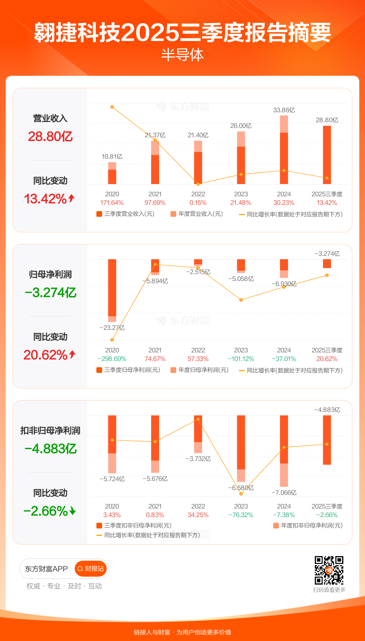 翱捷科技10月31日发布2025年三季报显示,公司前三季实现营业收入28.80亿元,同比增长13.42%;归母净利润-3.27亿元;扣非归母净利润-4.88亿元。