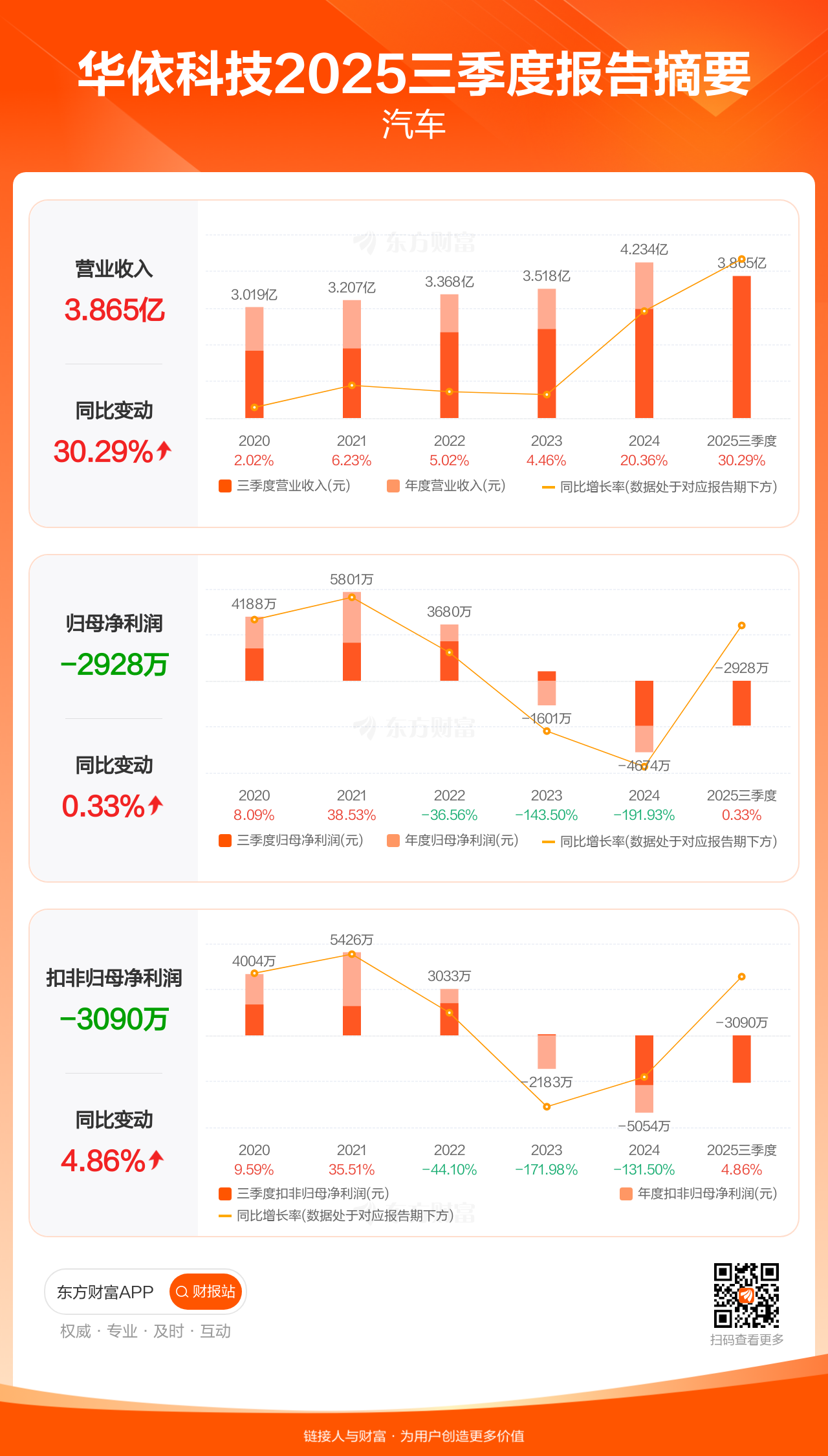 华依科技10月31日发布2025年三季报显示,公司前三季实现营业收入3.86亿元,同比增长30.29%;归母净利润-2928.18万元;扣非归母净利润-3090.28万元。