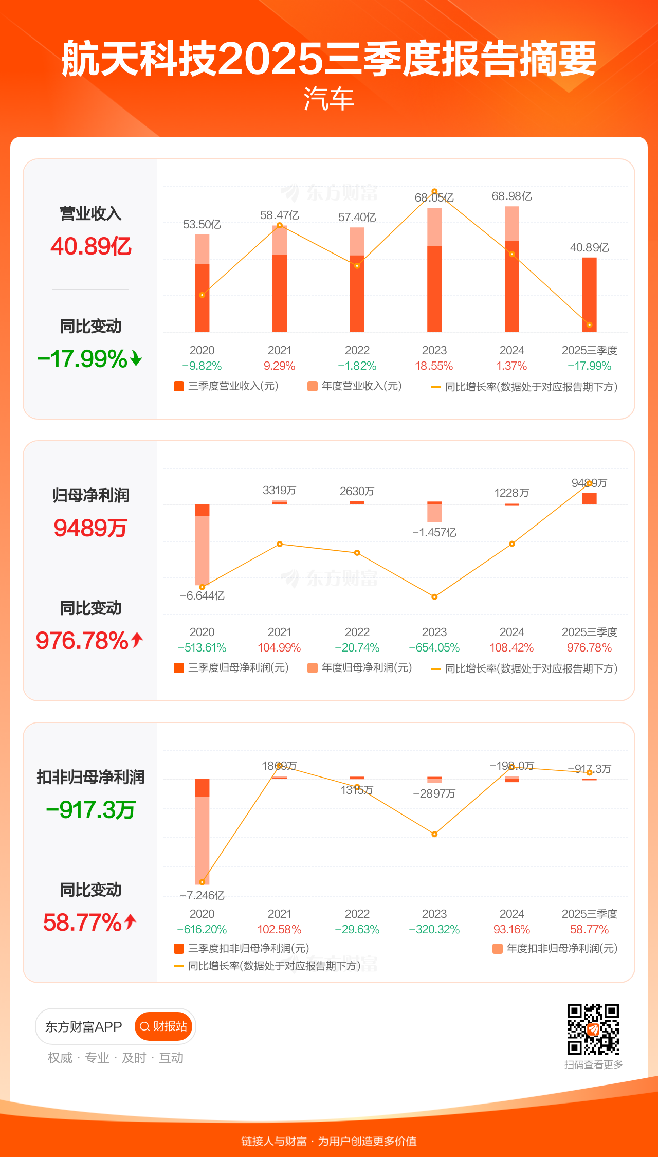 航天科技10月31日发布2025年三季报显示,公司前三季实现营业收入40.89亿元,同比下滑17.99%;归母净利润9489.27万元,同比增长976.78%;扣非归母净利润-917.26万元