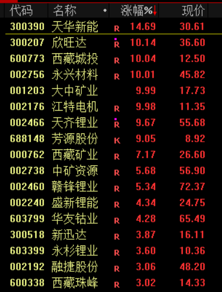锂电池板块逆市走强,天齐锂业、西藏城投等多股涨停。