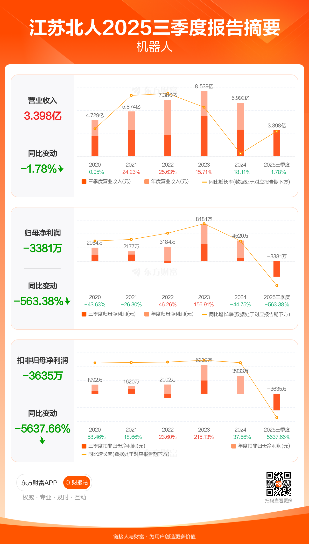 江苏北人10月31日发布2025年三季报显示,公司前三季实现营业收入3.40亿元,同比下滑1.78%;归母净利润-3381.06万元;扣非归母净利润-3635.23万元。
