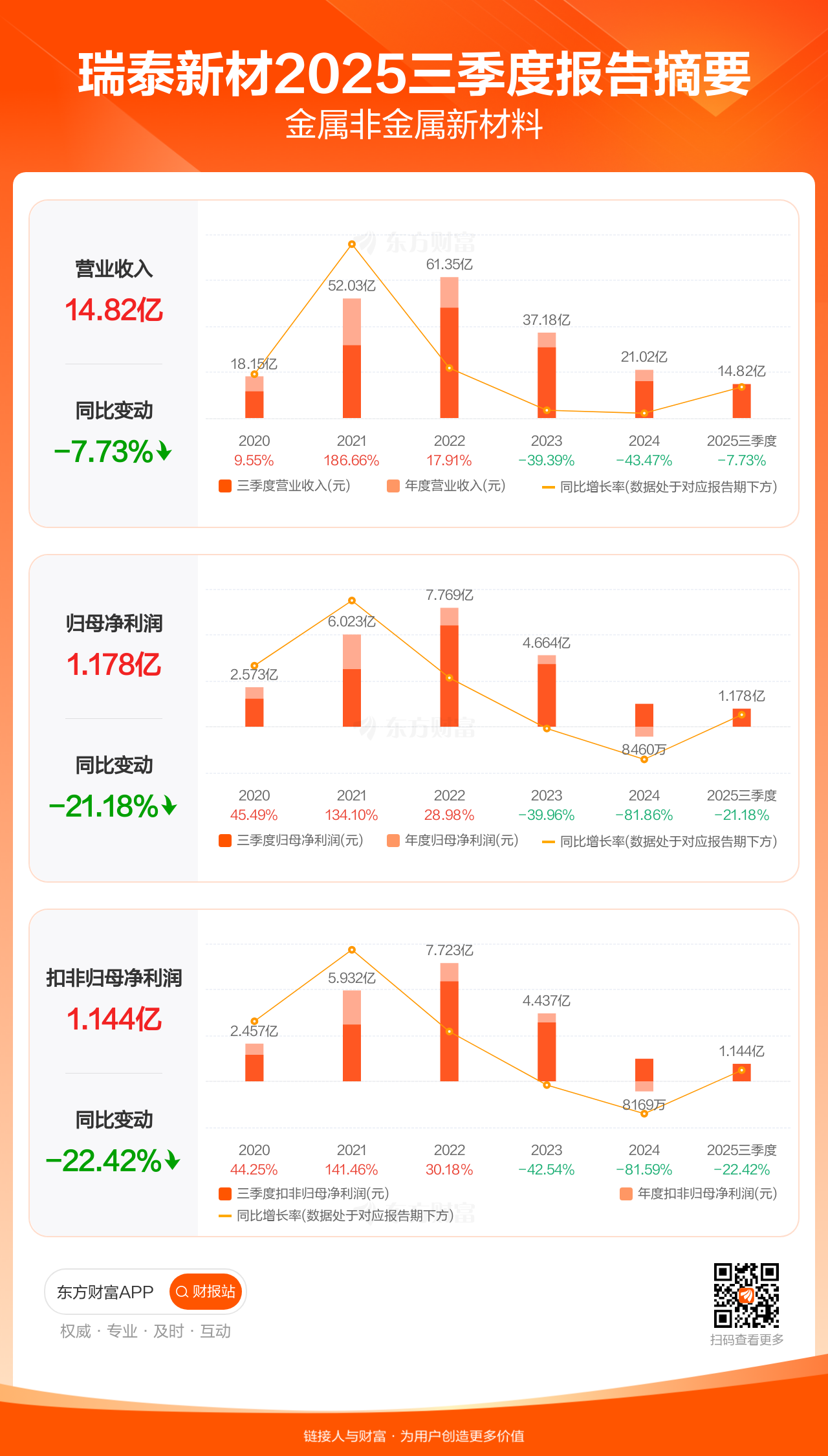 瑞泰新材10月31日发布2025年三季报显示,公司前三季实现营业收入14.82亿元,同比下滑7.73%;归母净利润1.18亿元,同比下滑21.18%;扣非归母净利润1.14亿元,同比下滑22.42%。