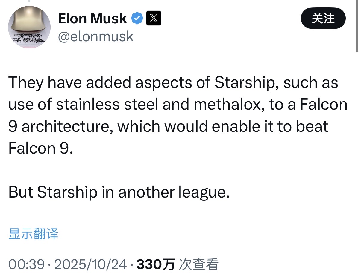 日前,马斯克还在社交平台上评论朱雀三号称:“中国的可复用火箭在猎鹰9号架构中加入了星舰的一些特性,例如使用不锈钢和液氧甲烷,这将使其能够超越猎鹰9号。”但其也表示“星舰属于另一个等级”。