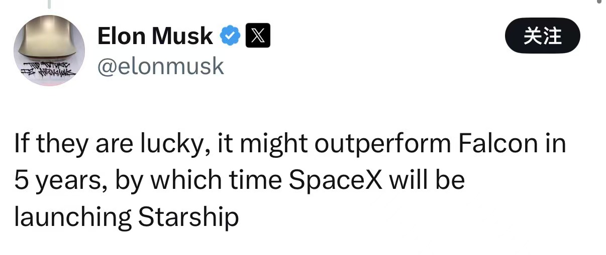 马斯克次日进一步发文称,如果一切顺利,朱雀三号可能会在五年内超过猎鹰,到那时SpaceX已开始发射星舰了。