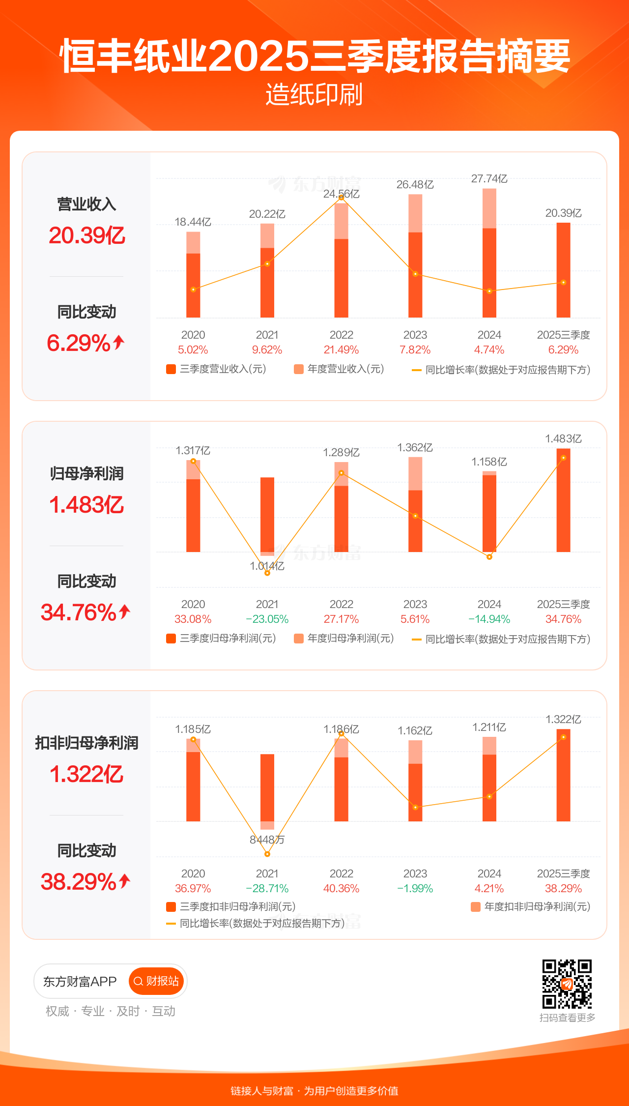 恒丰纸业10月31日发布2025年三季报显示,公司前三季实现营业收入20.39亿元,同比增长6.29%;归母净利润1.48亿元,同比增长34.76%;扣非归母净利润1.32亿元,同比增长38.29%。