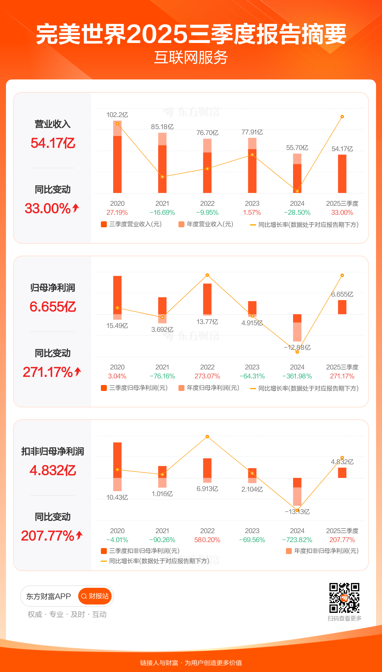 完美世界10月31日发布2025年三季报显示,公司前三季实现营业收入54.17亿元,同比增长33.00%;归母净利润6.66亿元,同比增长271.17%;扣非归母净利润4.83亿元,同比增长207.77%。
