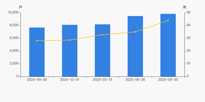 自2024年9月30日以来,公司股东户数连续4期上涨,截至目前增幅为27.97%。2024年9月30日至2025年9月30日区间股价上涨56.92%。