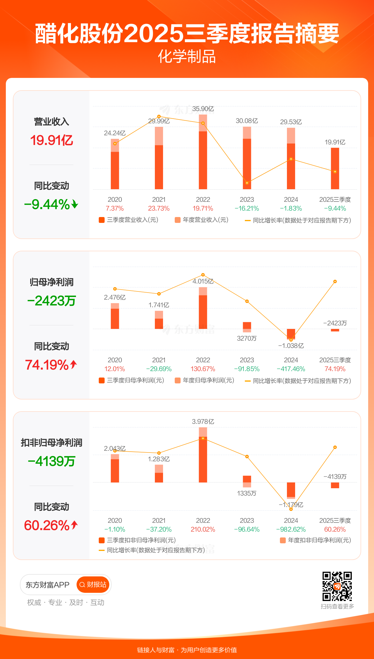 醋化股份10月31日发布2025年三季报显示,公司前三季实现营业收入19.91亿元,同比下滑9.44%;归母净利润-2423.02万元;扣非归母净利润-4138.92万元。