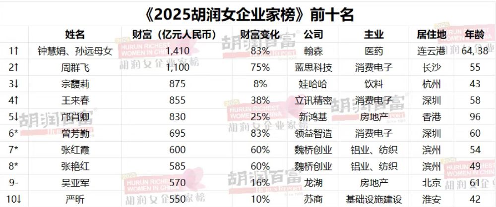 除了医药领域的钟慧娟外,《2025胡润女企业家榜》显示,得益于短视频热度与全球智能设备需求释放,消费电子领域成为女企业家财富增长的核心动力。55岁的蓝思科技周群飞财富增长470亿元,以1100亿元位列第二;58岁的立讯精密王来春与60岁的领益智造曾芳勤财富分别上涨235亿元、315亿元,分别以855亿元、695亿元位列第四和第六。
