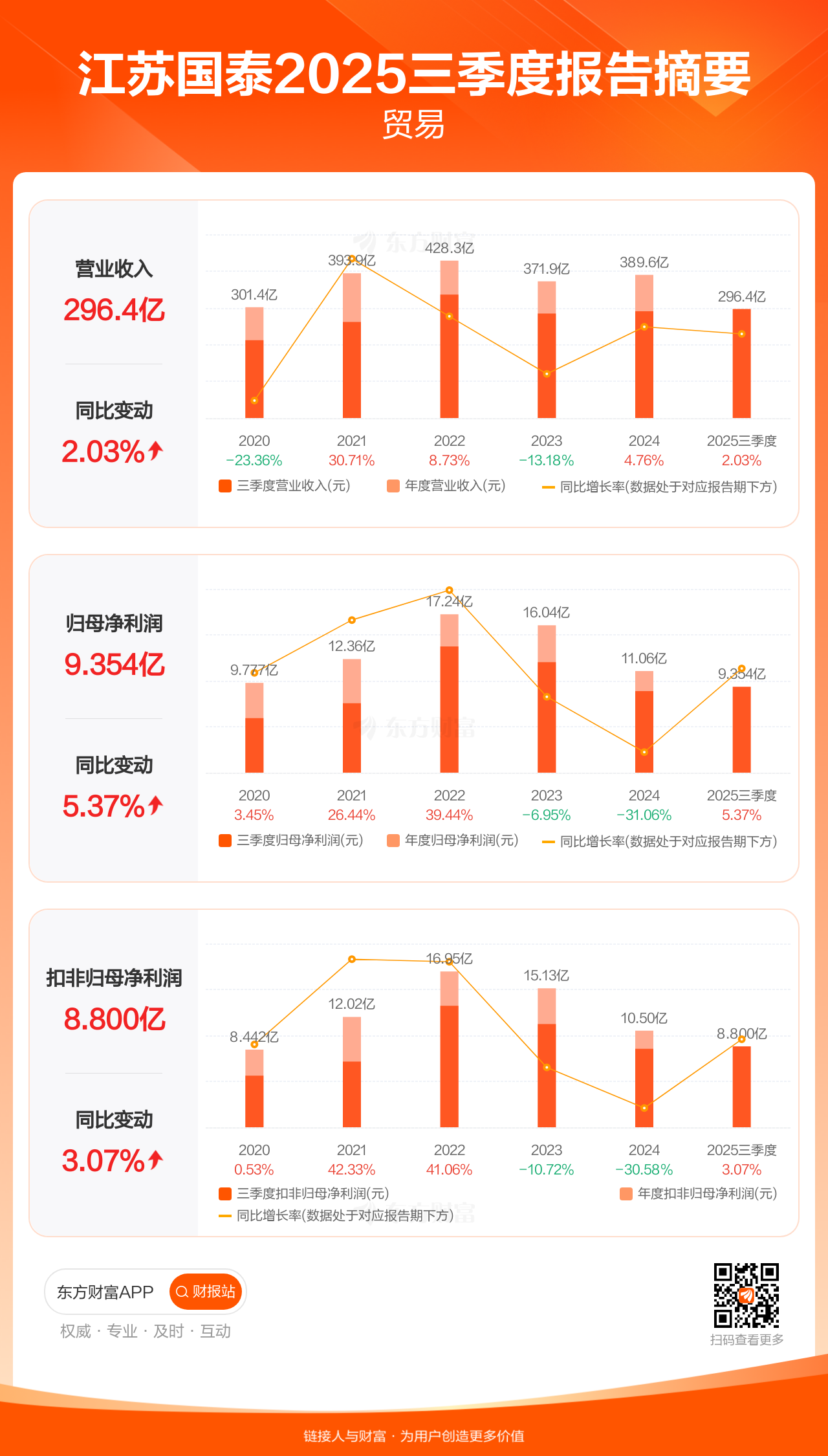 江苏国泰10月31日发布2025年三季报显示,公司前三季实现营业收入296.45亿元,同比增长2.03%;归母净利润9.35亿元,同比增长5.37%;扣非归母净利润8.80亿元,同比增长3.07%