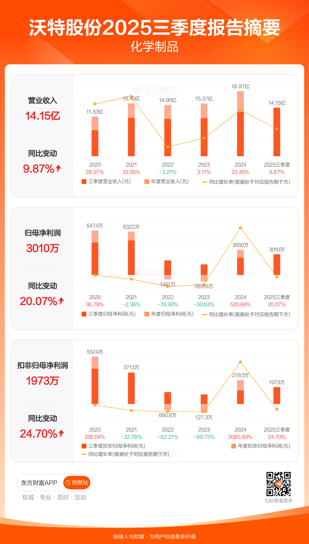 沃特股份10月31日发布2025年三季报显示,公司前三季实现营业收入14.15亿元,同比增长9.87%;归母净利润3009.97万元,同比增长20.07%;扣非归母净利润1973.21万元,同比增长24.70%。