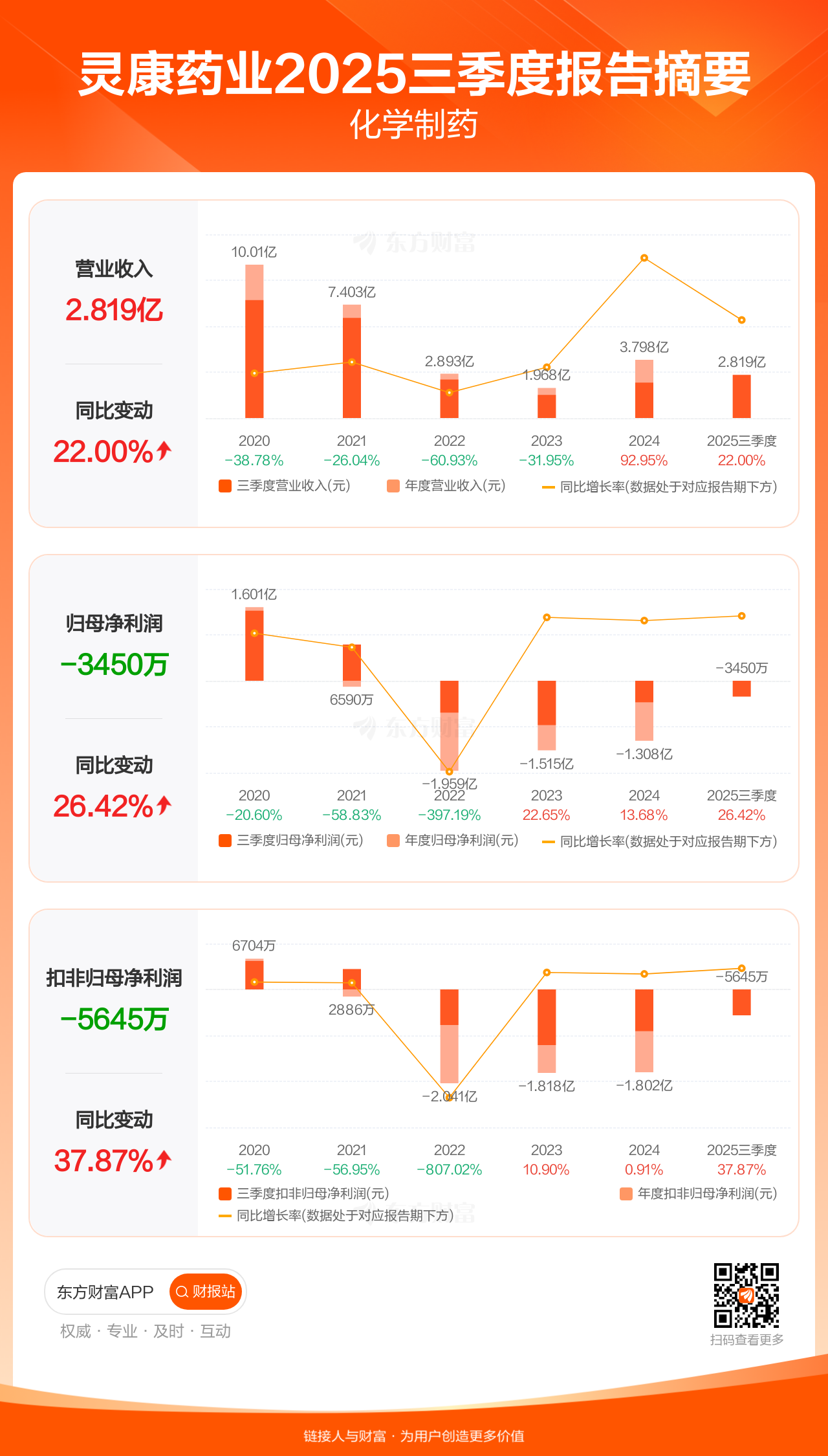 灵康药业10月31日发布2025年三季报显示,公司前三季实现营业收入2.82亿元,同比增长22.00%;归母净利润-3450.31万元;扣非归母净利润-5645.40万元。