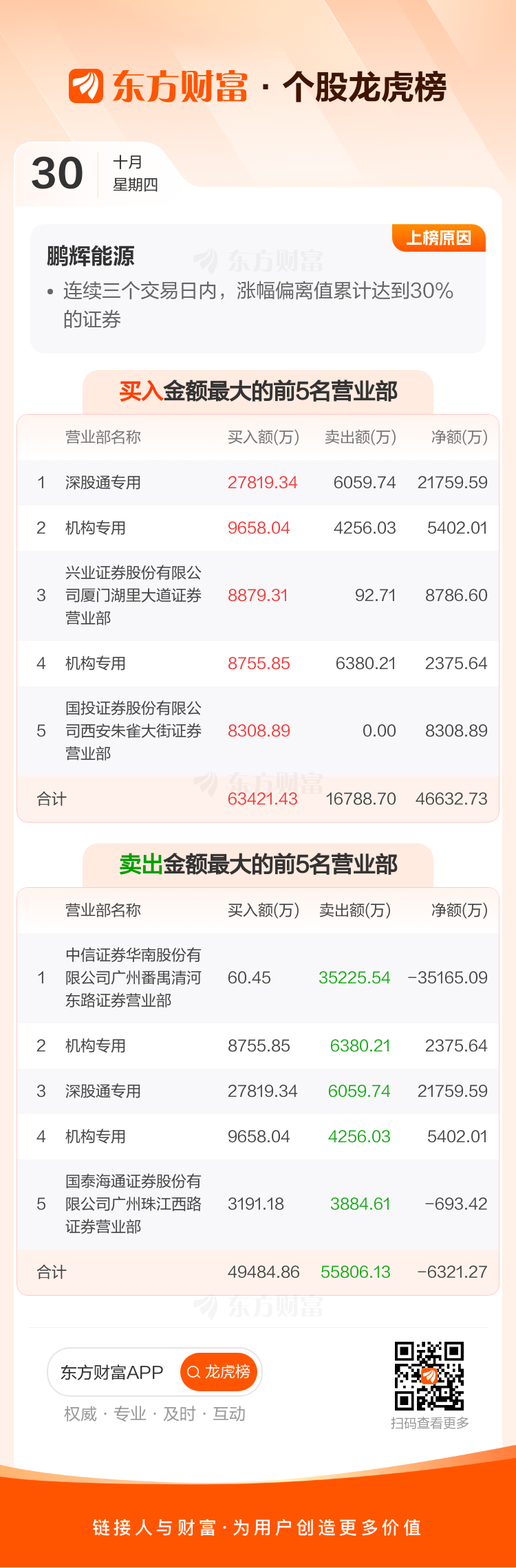 鹏辉能源(300438)龙虎榜数据(10-30)