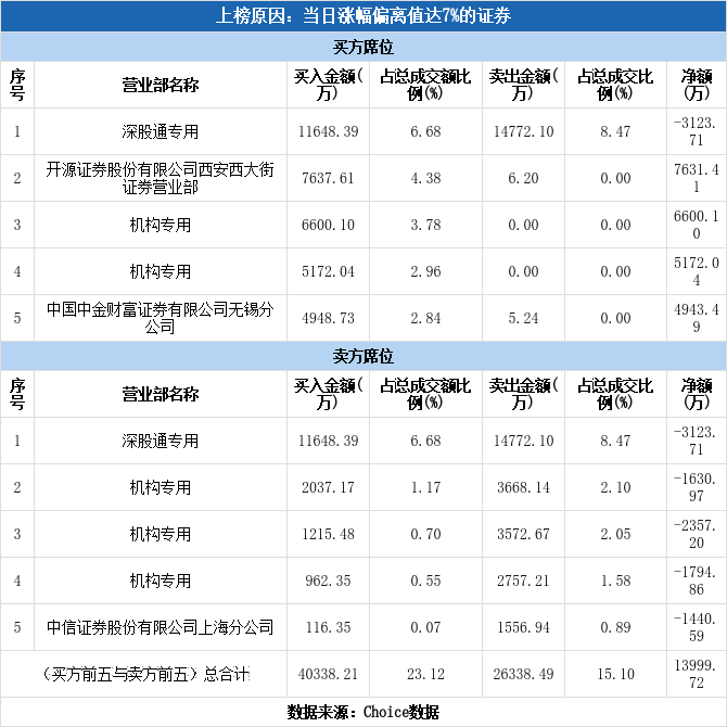今日龙虎榜单上出现了深股通的身影,占据了买一、卖一的位置,净卖出3123.71万元,占当日成交总额的1.79%。