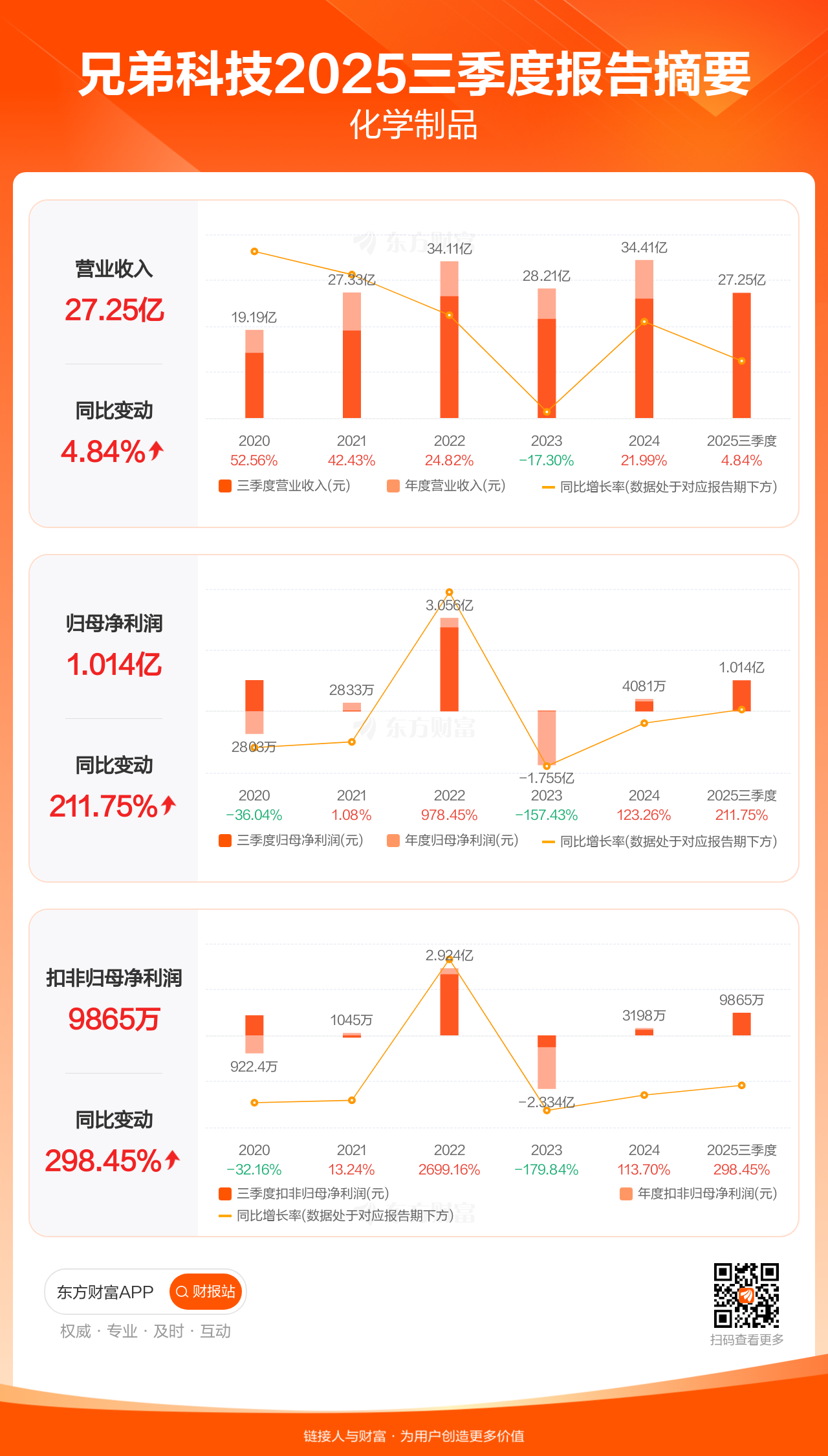 兄弟科技10月31日发布2025年三季报显示,公司前三季实现营业收入27.25亿元,同比增长4.84%;归母净利润1.01亿元,同比增长211.75%;扣非归母净利润9864.92万元,同比增长298.45%。