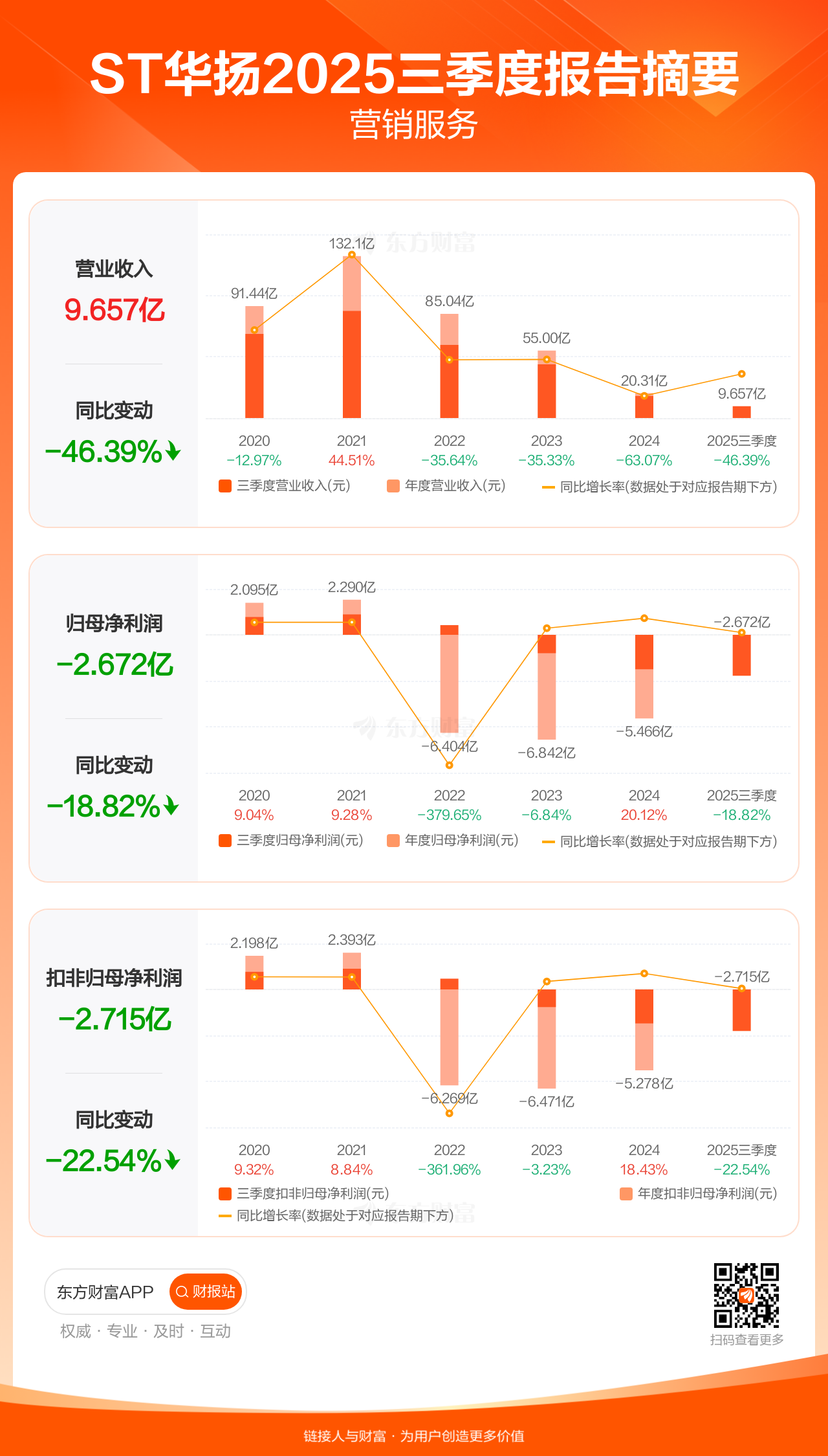 ST华扬10月31日发布2025年三季报显示,公司前三季实现营业收入9.66亿元,同比下滑46.39%;归母净利润-2.67亿元;扣非归母净利润-2.72亿元。