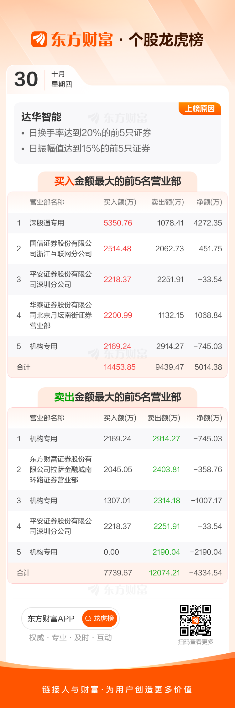 交易所2025年10月30日公布的交易公开信息显示,达华智能因成为日换手率达到20%的前5只证券、日振幅值达到15%的前5只证券上榜。达华智能当日收报5.1元,涨跌幅-1.73%,偏离值35.52%,换手率35.52%,成交额19.46亿。