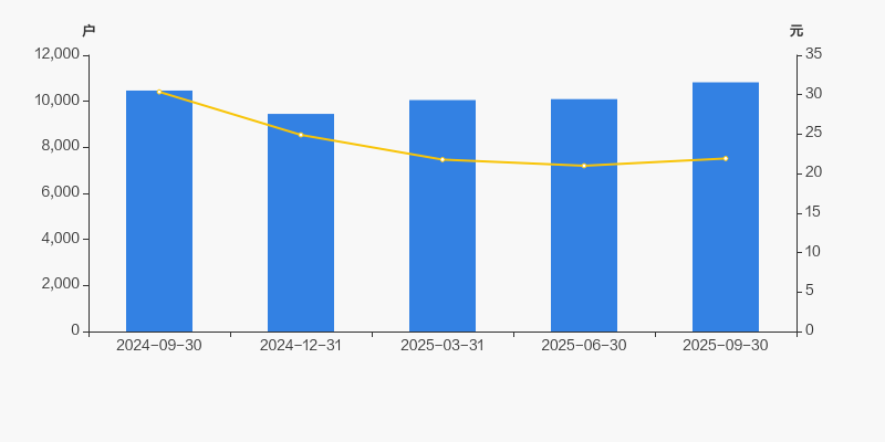 自2024年12月31日以来,公司股东户数连续3期上涨,截至目前增幅为14.50%。2024年12月31日至2025年9月30日区间股价下降12.00%。