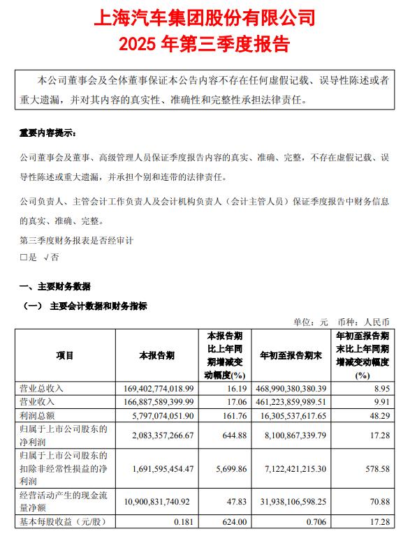 上汽集团:第三季度净利润20.83亿元 同比增长644.88%