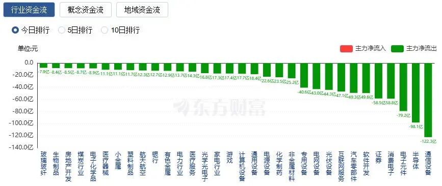 净流出方面,通信设备、半导体、电子元件等净流出排名靠前,其中通信设备净流出122.3亿元。