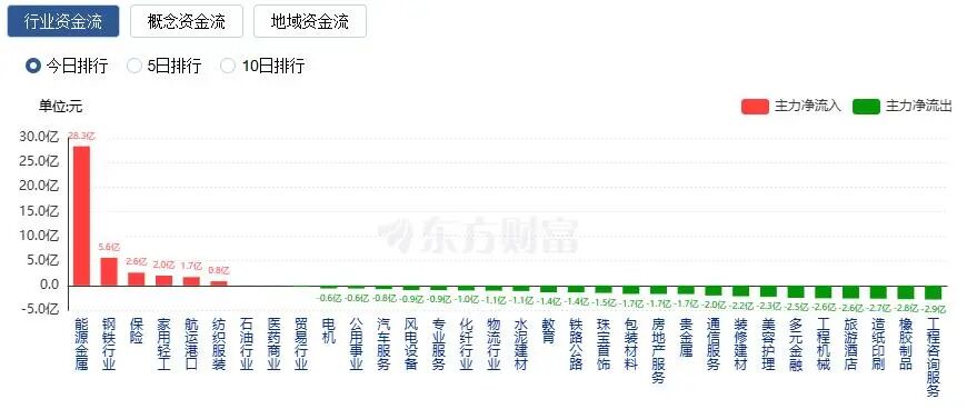 行业资金方面,截至收盘,能源金属、钢铁行业、保险等净流入排名靠前,其中能源金属净流入28.29亿。