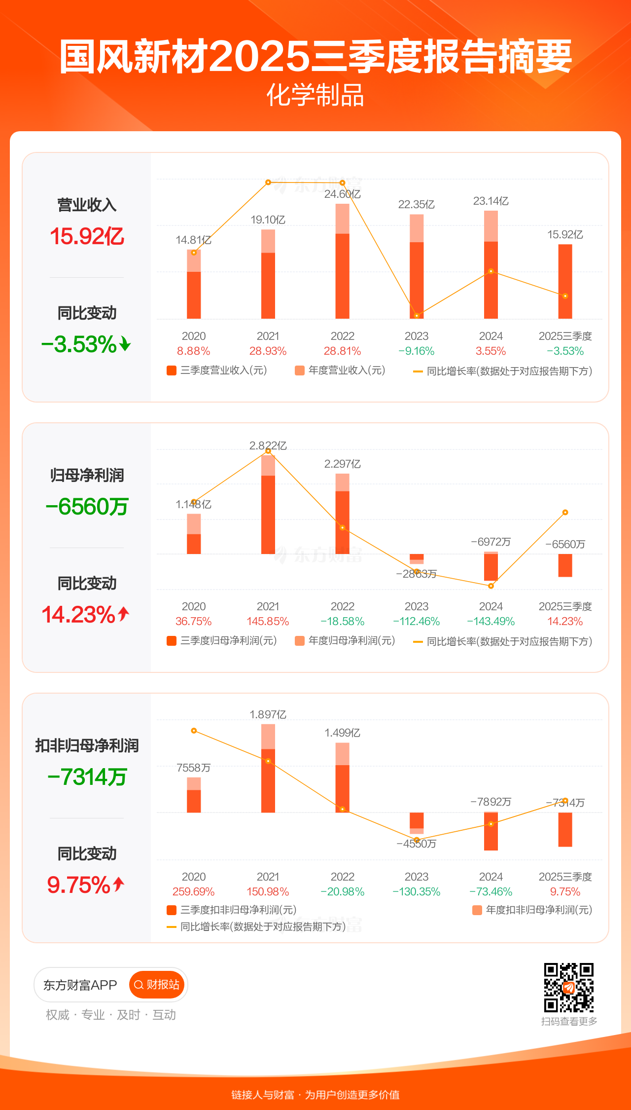 国风新材10月31日发布2025年三季报显示,公司前三季实现营业收入15.92亿元,同比下滑3.53%;归母净利润-6560.43万元;扣非归母净利润-7313.61万元。