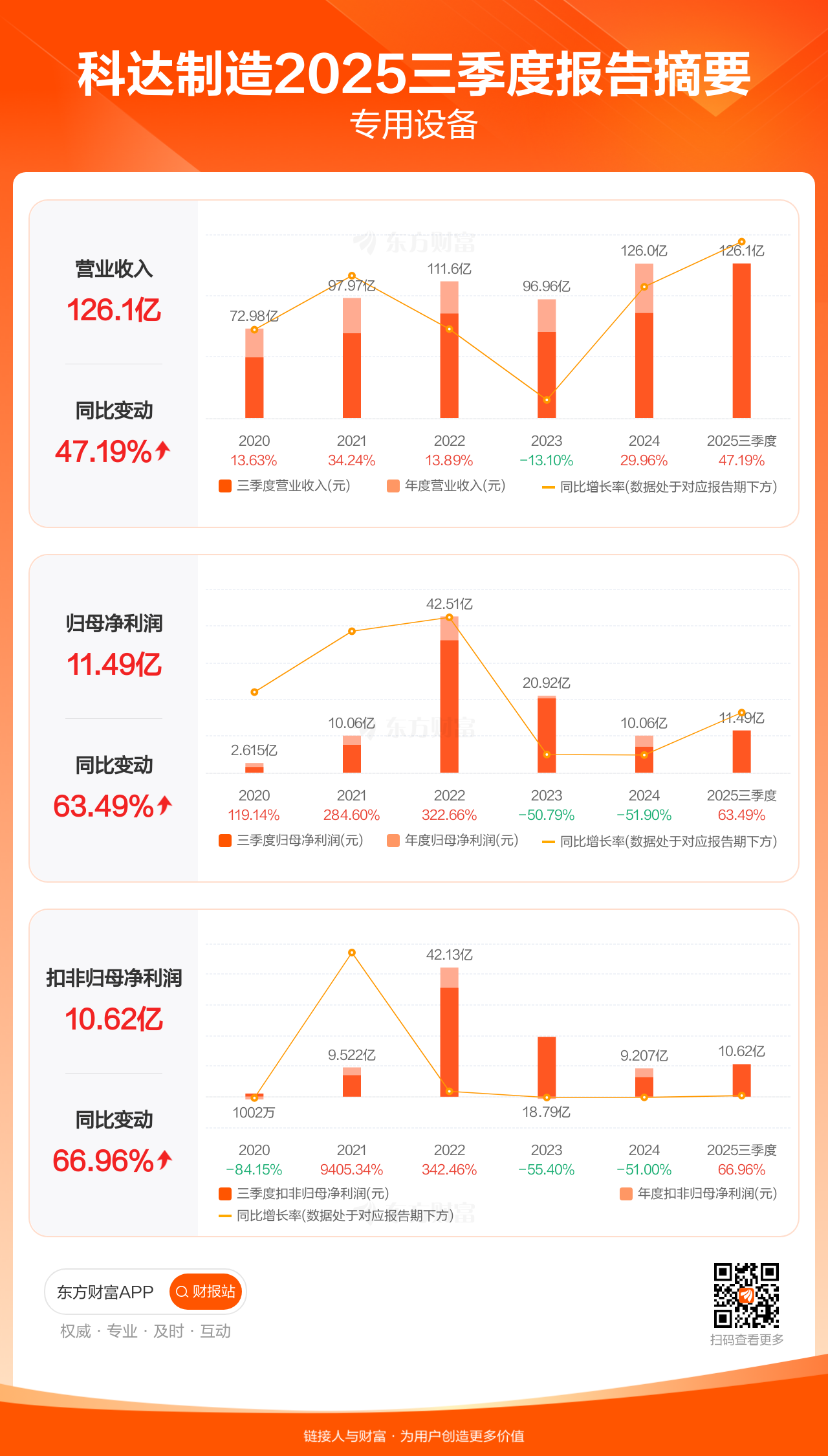 科达制造10月31日发布2025年三季报显示,公司前三季实现营业收入126.05亿元,同比增长47.19%;归母净利润11.49亿元,同比增长63.49%;扣非归母净利润10.62亿元,同比增长66.96%。