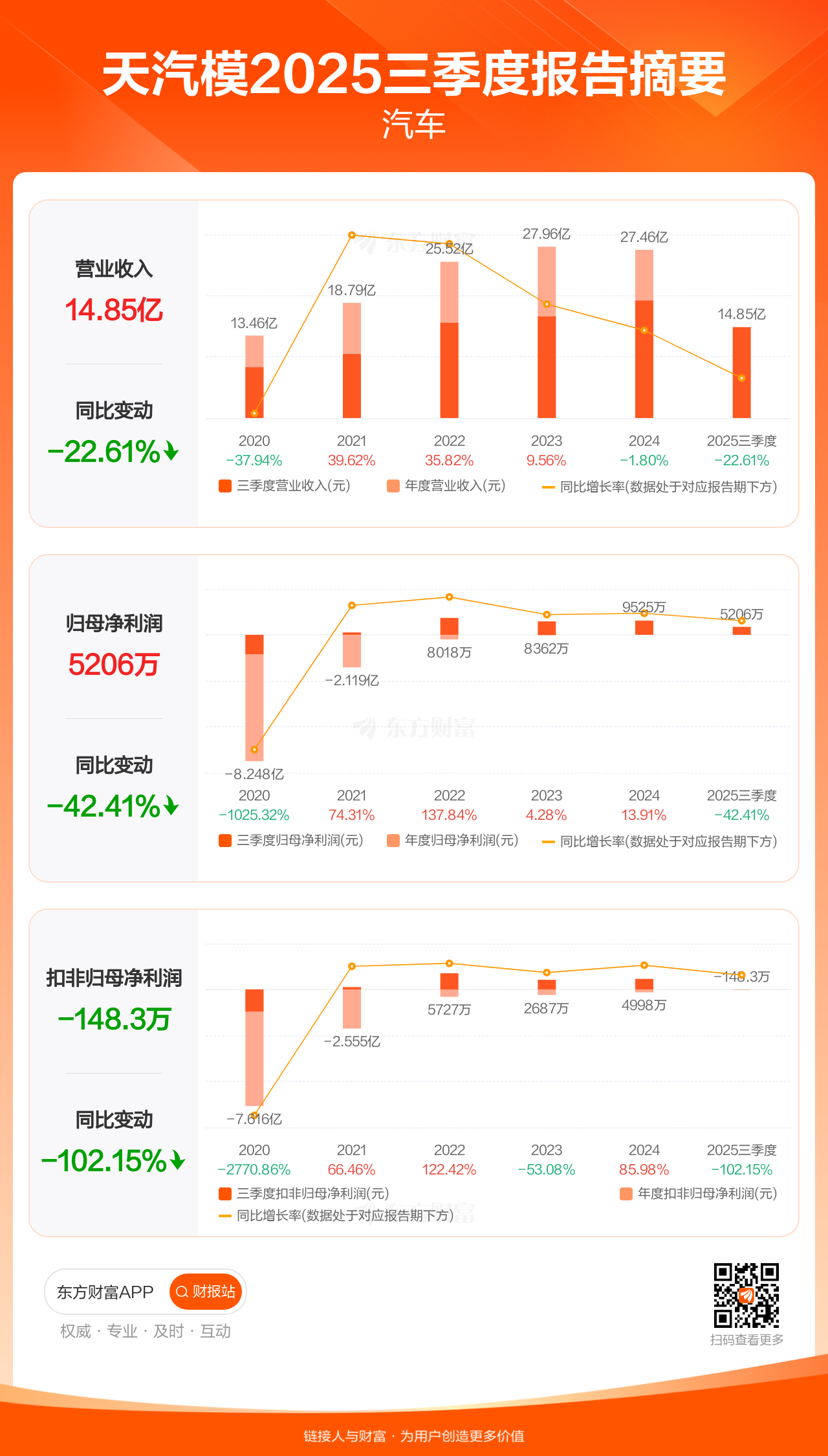 天汽模10月31日发布2025年三季报显示,公司前三季实现营业收入14.85亿元,同比下滑22.61%;归母净利润5206.09万元,同比下滑42.41%;扣非归母净利润-148.26万元。
