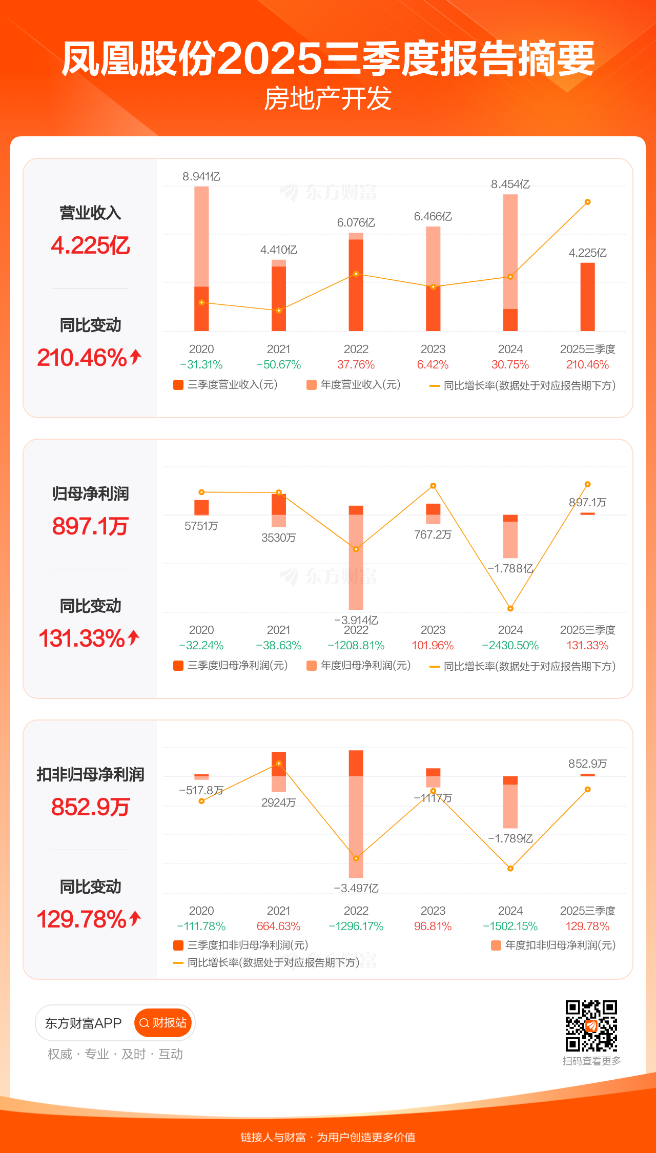 凤凰股份10月31日发布2025年三季报显示,公司前三季实现营业收入4.22亿元,同比增长210.46%;归母净利润897.05万元,同比增长131.33%;扣非归母净利润852.88万元,同比增长129.78%。