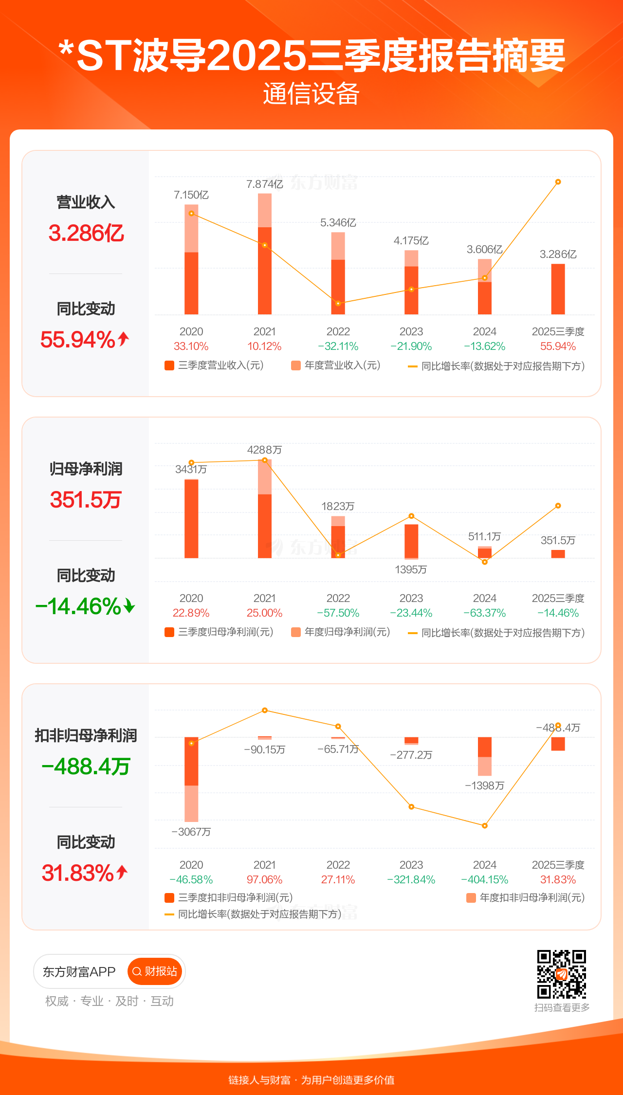 *ST波导10月31日发布2025年三季报显示,公司前三季实现营业收入3.29亿元,同比增长55.94%;归母净利润351.48万元,同比下滑14.46%;扣非归母净利润-488.42万元。