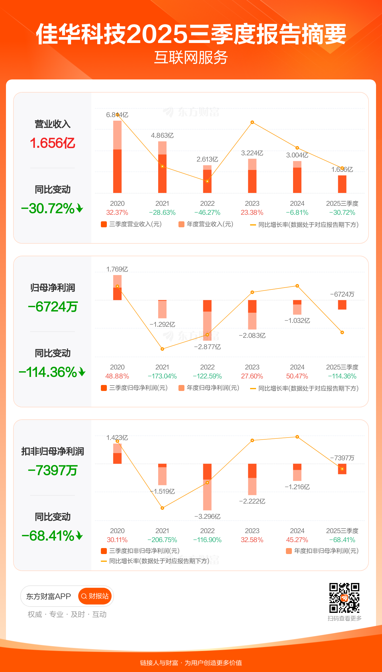 佳华科技10月31日发布2025年三季报显示,公司前三季实现营业收入1.66亿元,同比下滑30.72%;归母净利润-6723.79万元;扣非归母净利润-7396.86万元。
