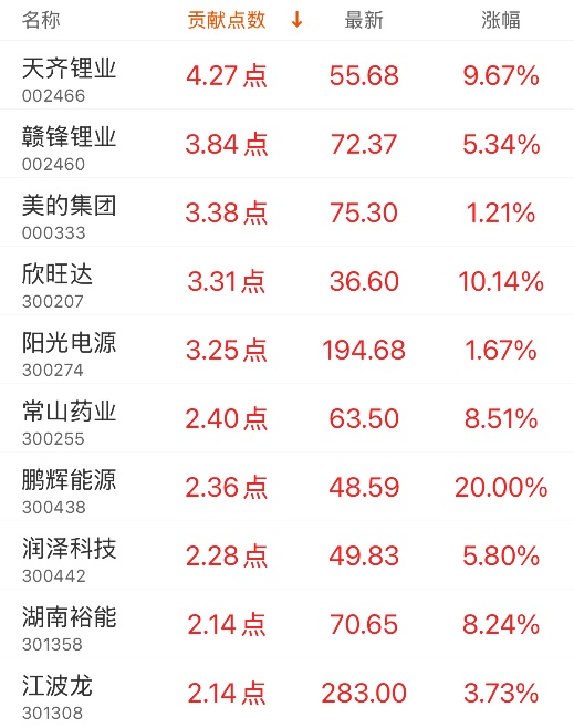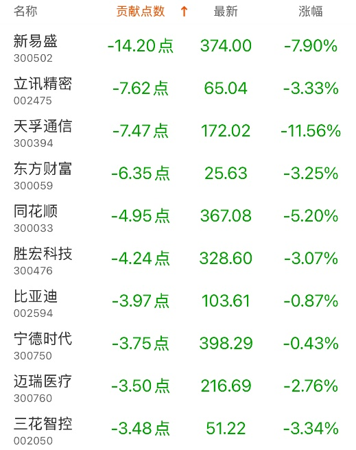 对深证成指贡献点数最多的个股是天齐锂业,贡献4.27点,该股当日涨9.67%,收盘价55.68元;拖累点数最多的个股是新易盛,拖累14.20点,该股当日跌7.90%,收盘价374元。