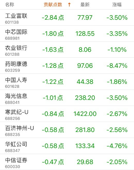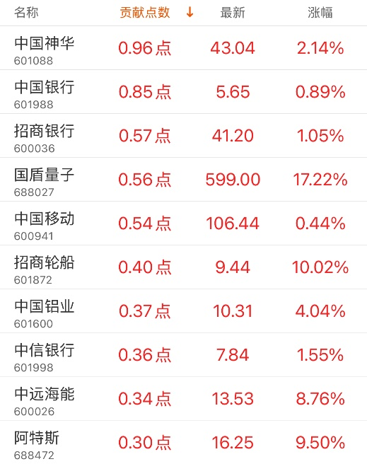 对上证指数贡献点数最多的个股是中国神华,贡献0.96点,该股当日涨2.14%,收盘价43.04元;拖累点数最多的个股是工业富联,拖累2.84点,该股当日跌3.50%,收盘价77.97元。