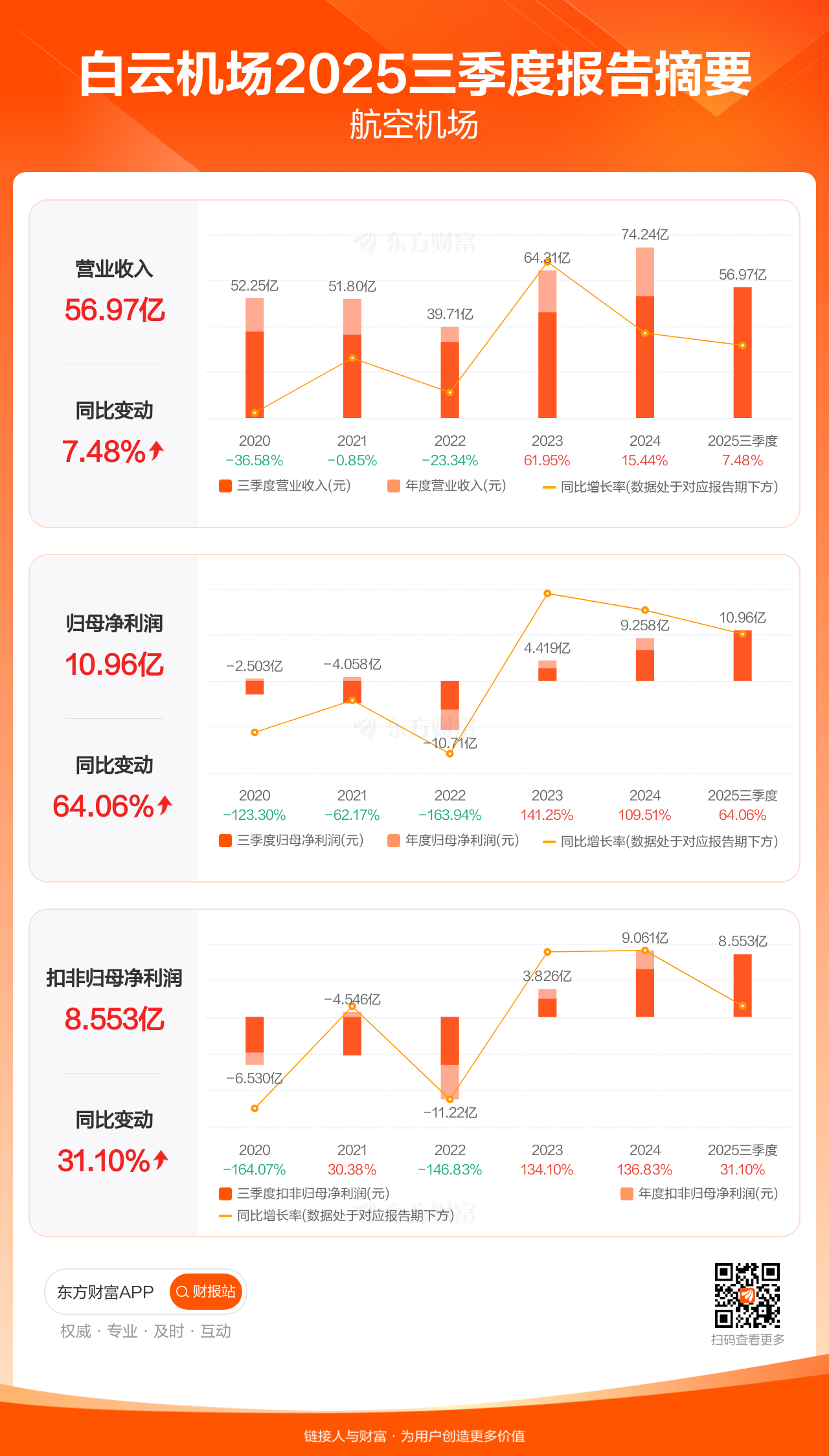 白云机场10月31日发布2025年三季报显示,公司前三季实现营业收入56.97亿元,同比增长7.48%;归母净利润10.96亿元,同比增长64.06%;扣非归母净利润8.55亿元,同比增长31.10%。