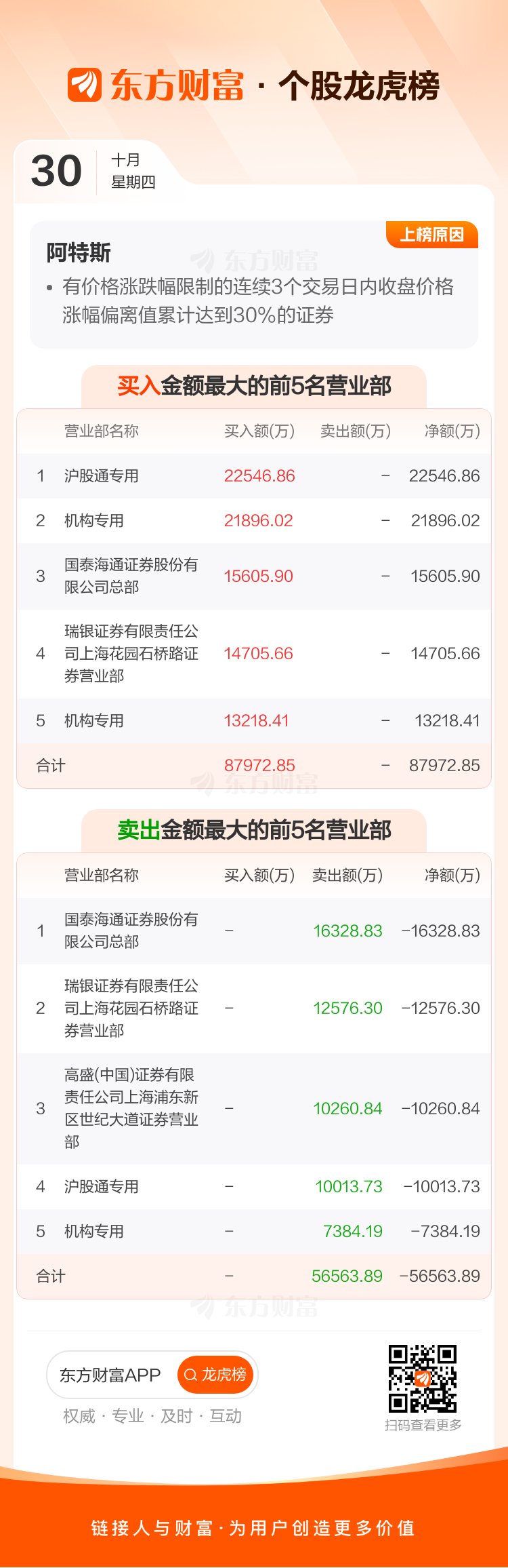 交易所2025年10月30日公布的交易公开信息显示,阿特斯因成为有价格涨跌幅限制的连续3个交易日内收盘价格涨幅偏离值累计达到30%的证券上榜。阿特斯当日收报16.25元,涨跌幅9.50%,换手率16.19%,成交额36.72亿。异常期间10月29日至10月30日,期间涨幅31.37%,累计偏离值32.07%,区间成交额59.37亿。