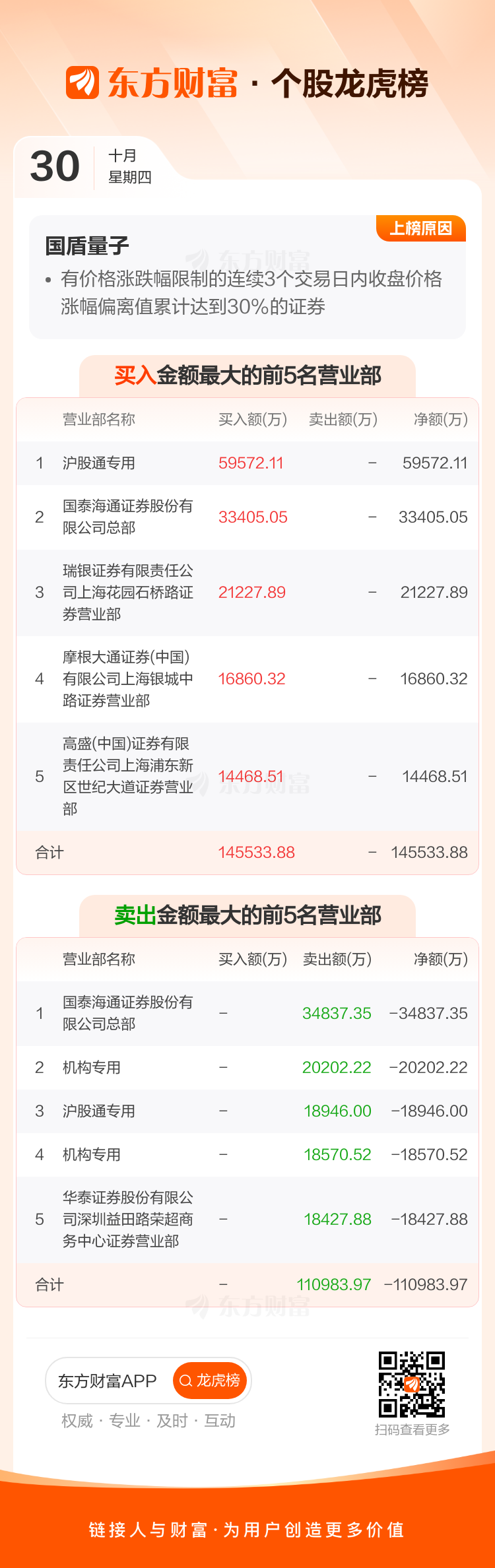 交易所2025年10月30日公布的交易公开信息显示,国盾量子因成为有价格涨跌幅限制的日收盘价格涨幅达到15%的前五只证券、有价格涨跌幅限制的连续3个交易日内收盘价格涨幅偏离值累计达到30%的证券上榜。国盾量子当日收报599元,涨跌幅17.22%,偏离值17.22%,换手率15.28%,成交额69.96亿。异常期间10月29日至10月30日,期间涨幅30.22%,累计偏离值30.93%,区间成交额113.62亿。