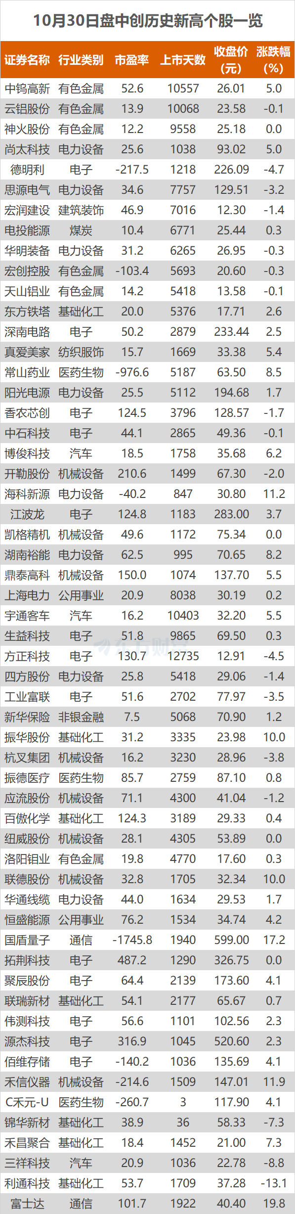 10月30日,A股三大指数今日集体回调,沪指失守4000点大关。截止收盘,沪指跌0.73%,收报3986.90点;深证成指跌1.16%,收报13532.13点;创业板指跌1.84%,收报3263.02点。东方财富Choice数据显示,今日有56只个股盘中股价创历史新高,分别为工业富联、阳光电源等。