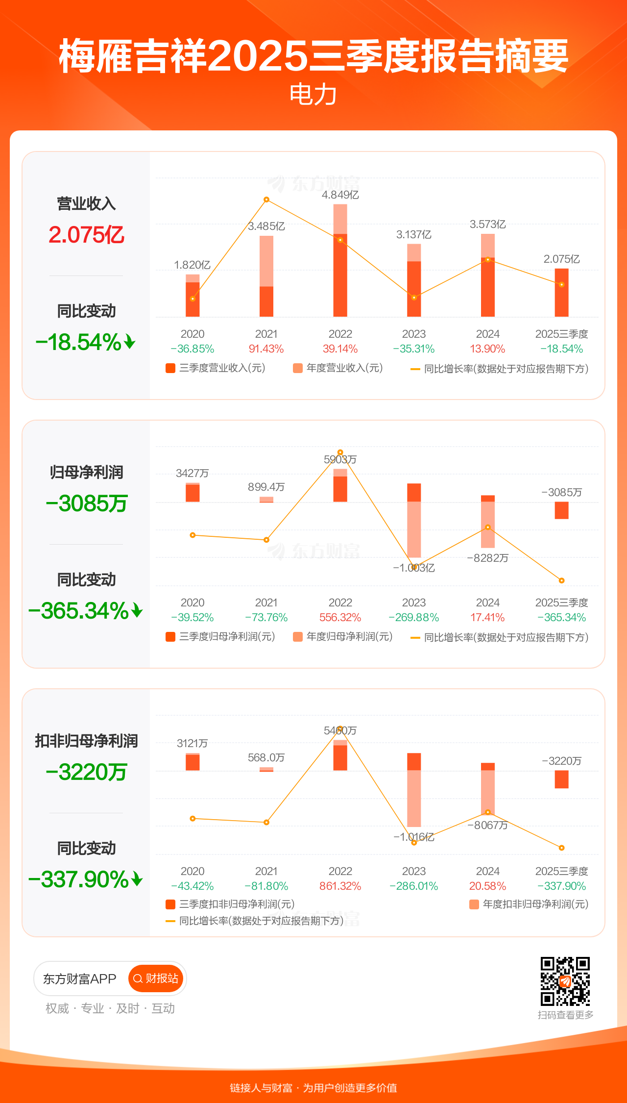 梅雁吉祥10月31日发布2025年三季报显示,公司前三季实现营业收入2.07亿元,同比下滑18.54%;归母净利润-3084.86万元;扣非归母净利润-3219.77万元。