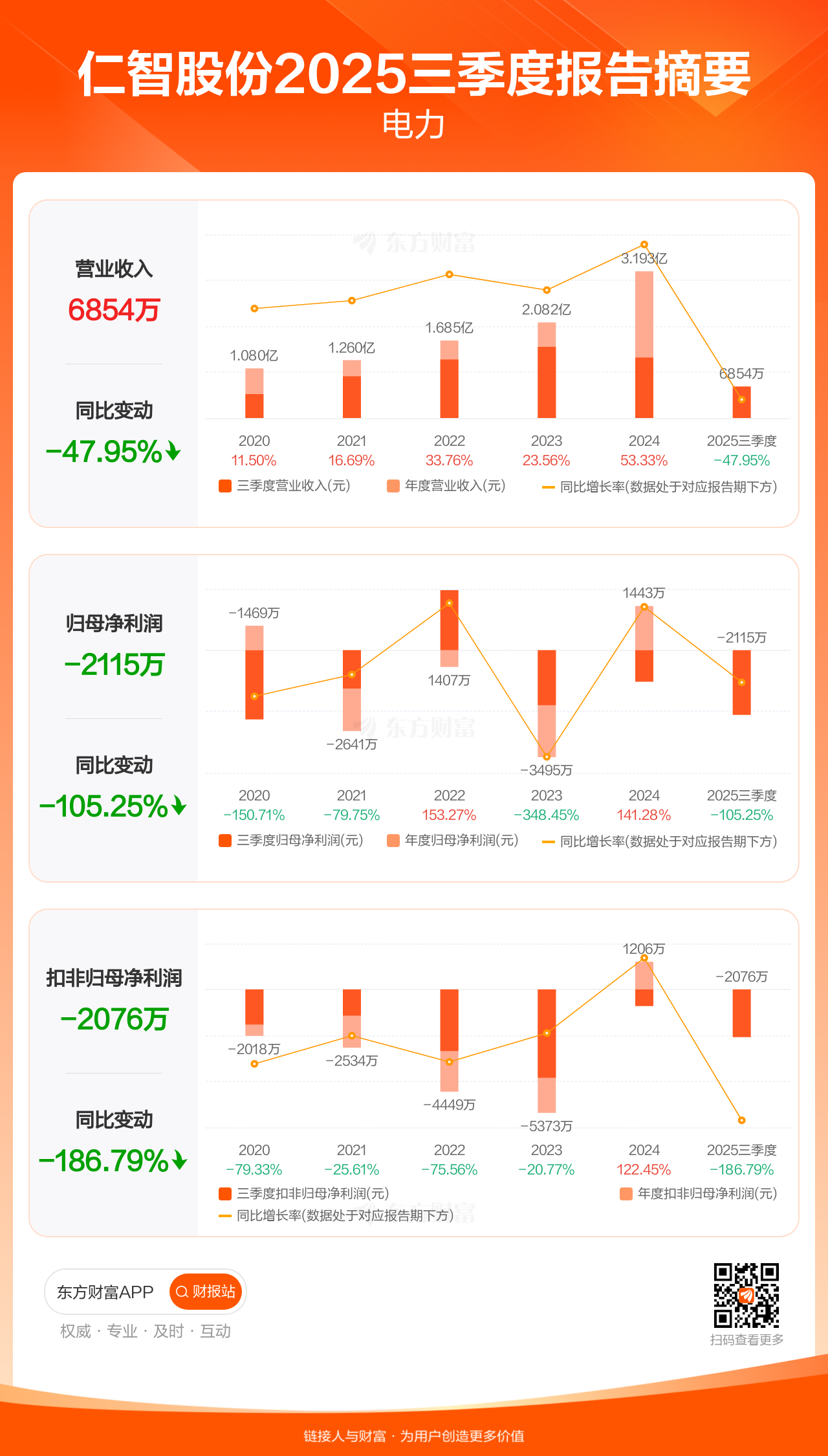 仁智股份10月31日发布2025年三季报显示,公司前三季实现营业收入6853.74万元,同比下滑47.95%;归母净利润-2115.12万元;扣非归母净利润-2075.57万元