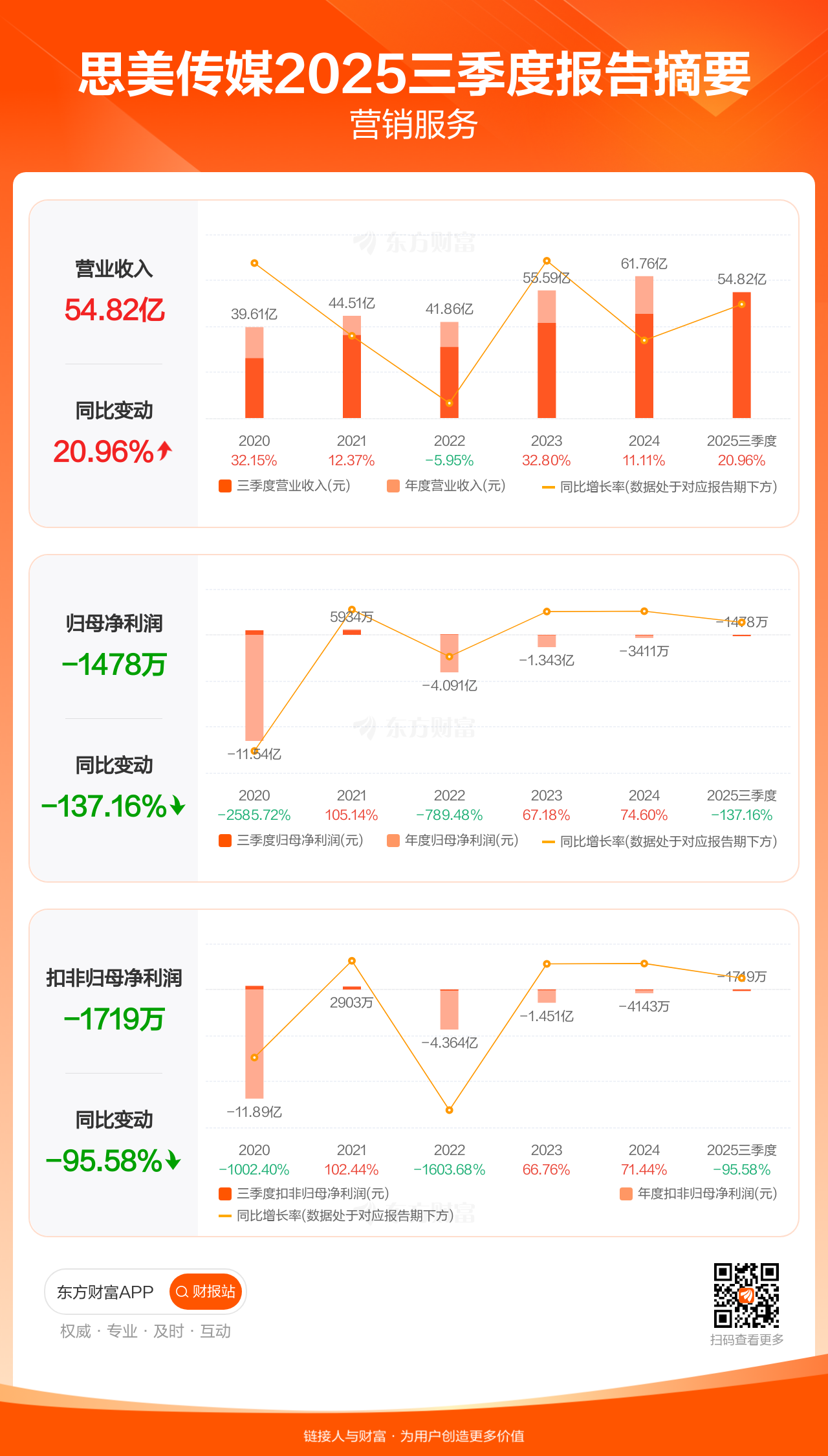 思美传媒10月31日发布2025年三季报显示,公司前三季实现营业收入54.82亿元,同比增长20.96%;归母净利润-1478.40万元;扣非归母净利润-1718.79万元。