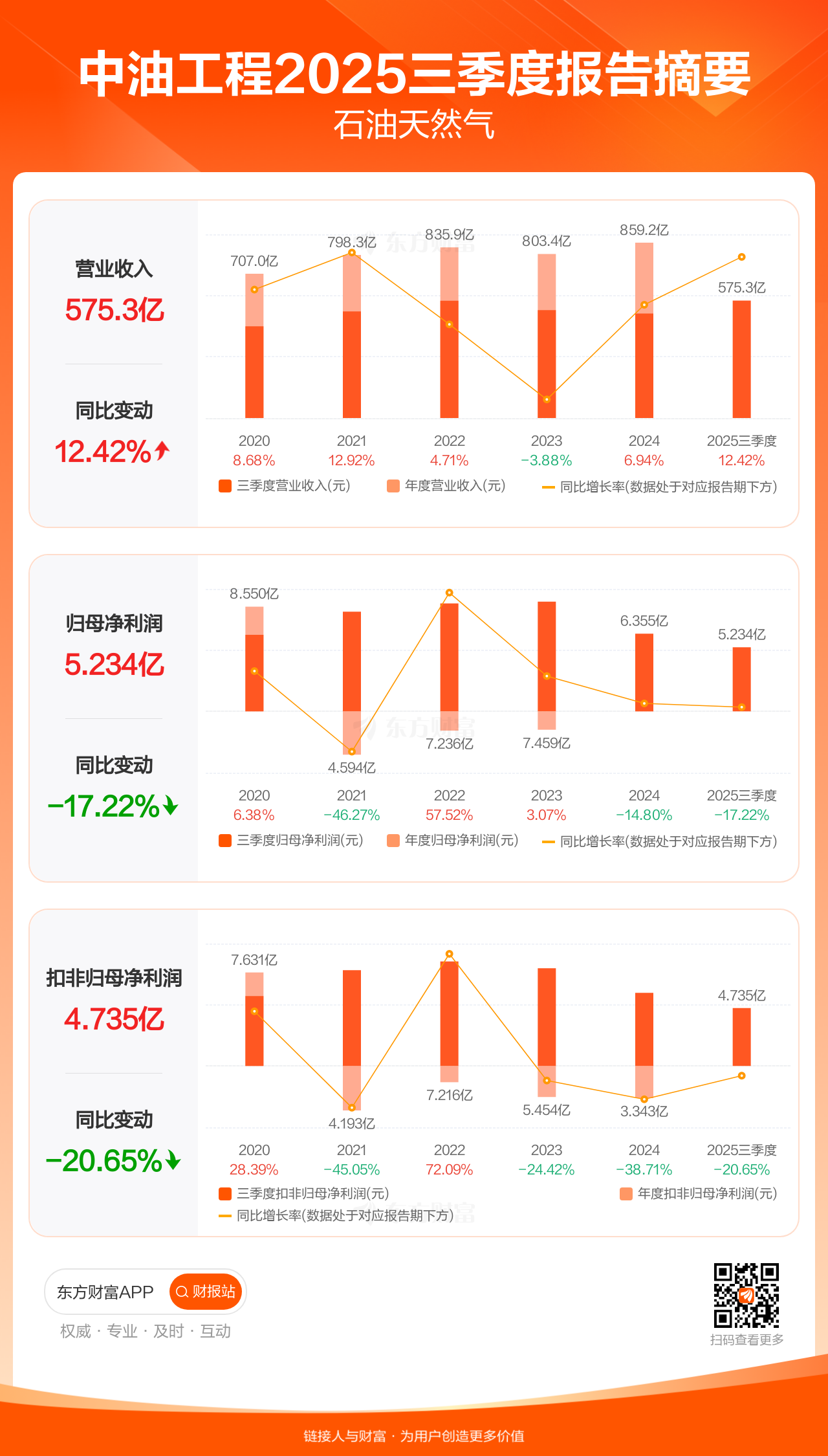 中油工程10月31日发布2025年三季报显示,公司前三季实现营业收入575.29亿元,同比增长12.42%;归母净利润5.23亿元,同比下滑17.22%;扣非归母净利润4.73亿元,同比下滑20.65%。