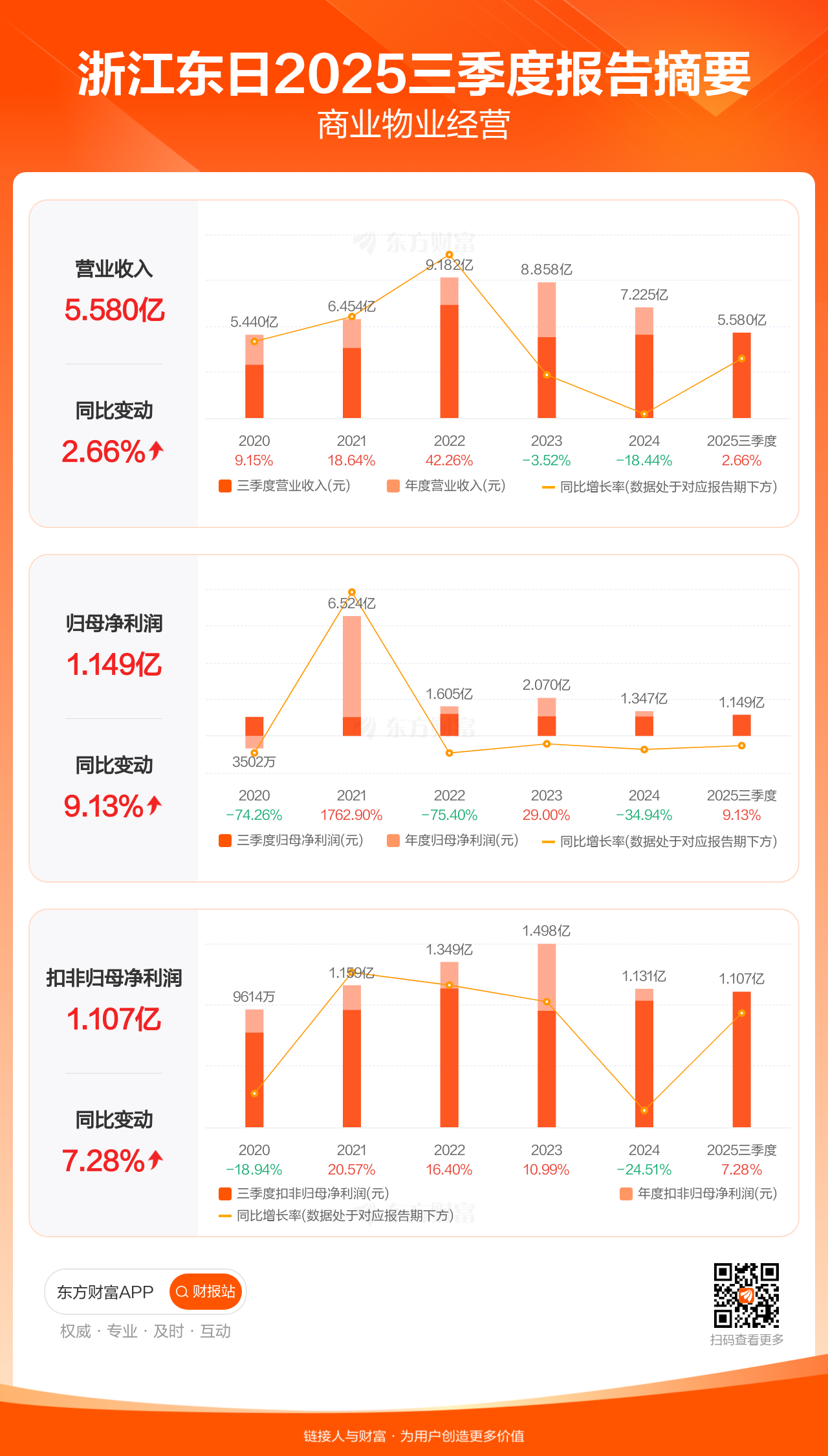 浙江东日10月31日发布2025年三季报显示,公司前三季实现营业收入5.58亿元,同比增长2.66%;归母净利润1.15亿元,同比增长9.13%;扣非归母净利润1.11亿元,同比增长7.28%。